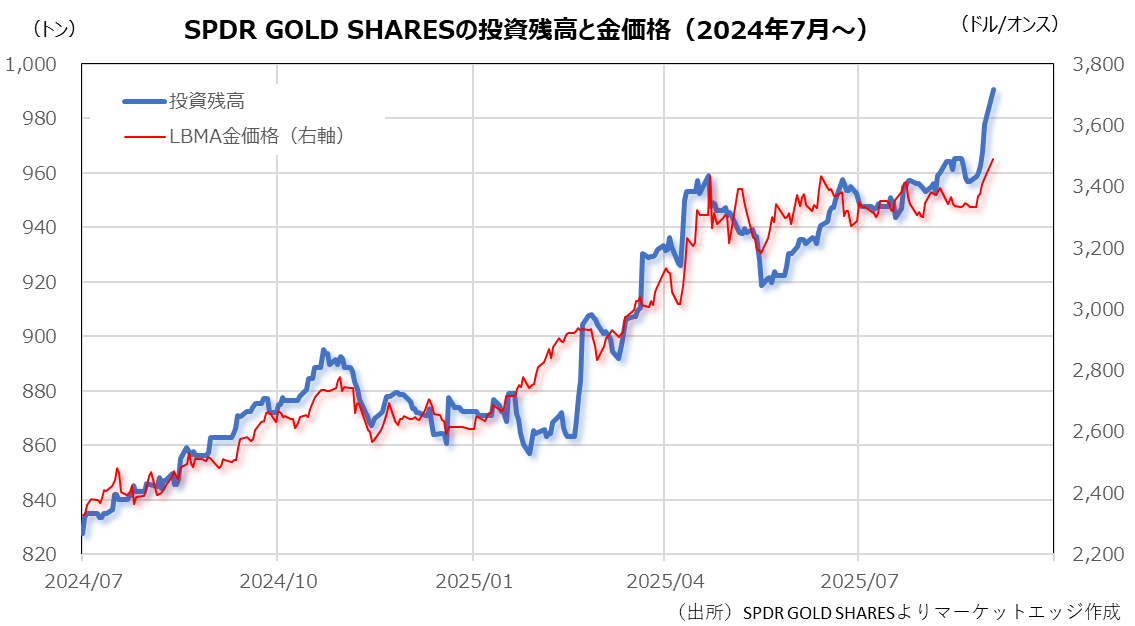 象徴的なのは、金上場投資信託(ETF)の投資残高の急増だ。「SPDR GOLD SHARES」の投資残高は、8月22日の956.77トンから、9月2日には990.56トンまで、わずか6営業日で33.79トン急増した。1~8月までの8ヵ月累計が105.16トンだったことと比較すると、ここ数日の金ETF市場に対する投資資金流入の急変は際立っている。