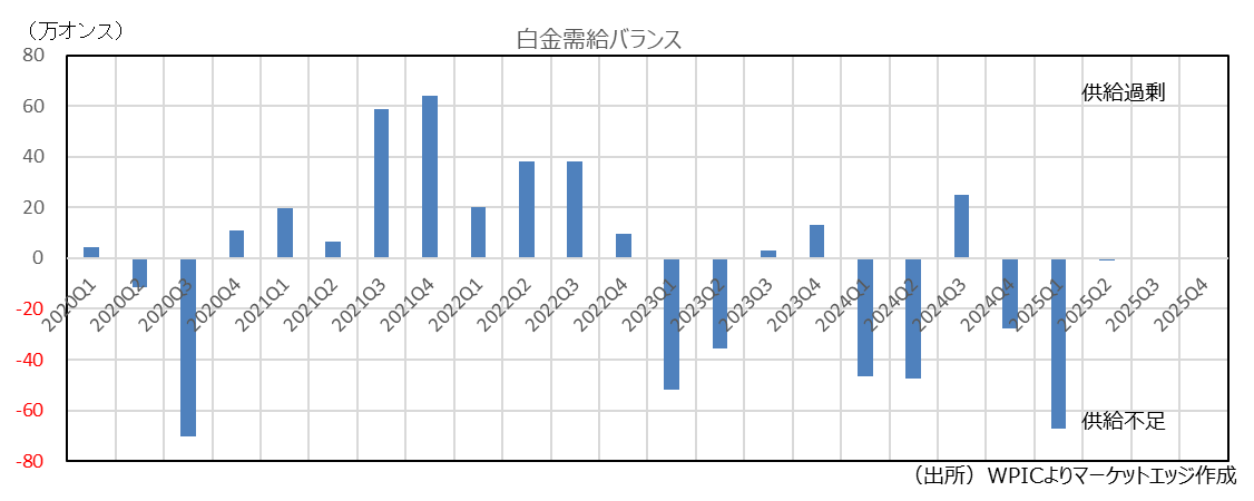 2025年通年だと供給が前年比3.5%減の702.7万オンス、需要が4.5%減の787.7万オンスであり、85.0万オンスの供給不足が見込まれている。24年の96.8万オンス、23年の71.2万オンスに続き、3年連続の供給不足の見通しになっている。地上在庫は22年末の550.8万オンスから、25年末には297.8万オンスへと急減する見通しにある。