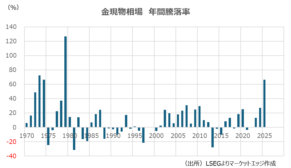 金価格の高騰が続いている。2025年の金価格の上昇率は10月16日時点で66.3%に達しており、多くの市場参加者にとって未経験の出来事だろう。2000~24年までの年間騰落率は平均で10.2%上昇、上昇年に限定しても17.0%上昇となっている。のちに世界同時金融危機に発展したサブプライムローン問題が深刻化し始めた07年の30.9%上昇が、おそらく現役の市場参加者が最後に経験した金の大相場になるのだろう。