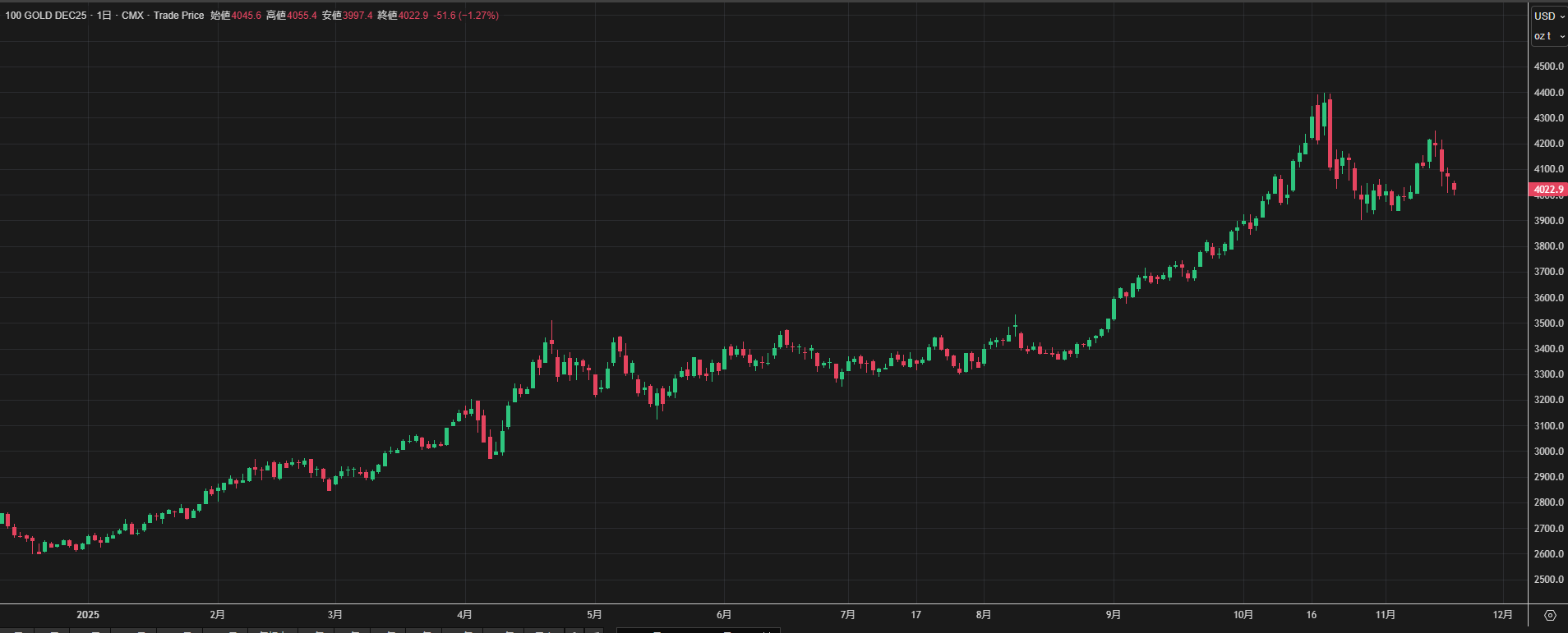 COMEX金先物相場は10月28日の1オンス=3,901.30ドルをボトムに11月13日の4,250.00ドルまで切り返していたが、足元では4,020ドル台まで反落する不安定な値動きが続いている。米政府機関閉鎖の見通しが立ち始めると、発表が再開される米経済指標で労働市場の減速が確認されるとの見通しから、米連邦準備制度理事会(FRB)の追加利下げ観測を織り込む形で地合が引き締まった。しかし、その後は複数の米金融当局者が利下げに慎重な発言を行ったため戻り売り圧力が強まり、結果的に明確な上昇トレンドを形成できていない。