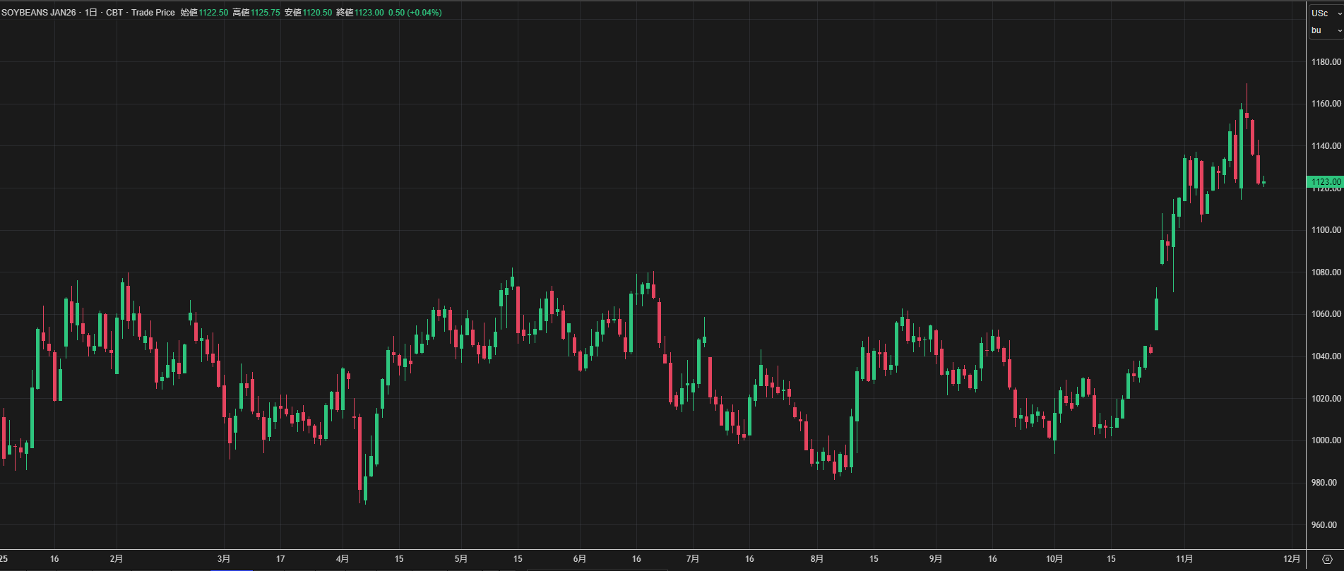 米中首脳会談については、ベッセント米財務長官が中国は年内に1,200万トン、向こう3年は最低2,500万トンの米国産大豆輸入を「約束した」と報告している。中国側からはこの件について具体的な説明が行われていないが、米国側の発表を否定するような動きは確認できていない。このため、マーケットもベッセント長官の発表した内容が合意事項との前提で、価格形成を進めている。