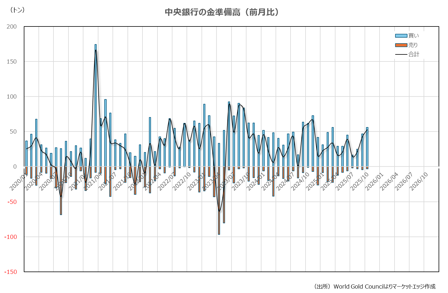 世界の中央銀行の金準備資産拡大が続いている。ワールド・ゴールド・カウンシル(WGC)の集計によると、10月の金保有高は前月比で52.76トン増加した。これは昨年11月以来の最大規模になる。10月は金相場が過去最高値を更新したタイミングだが、中央銀行は買い控えることなく、逆に金相場の高騰を支援する役割を果たしていることが確認できる。