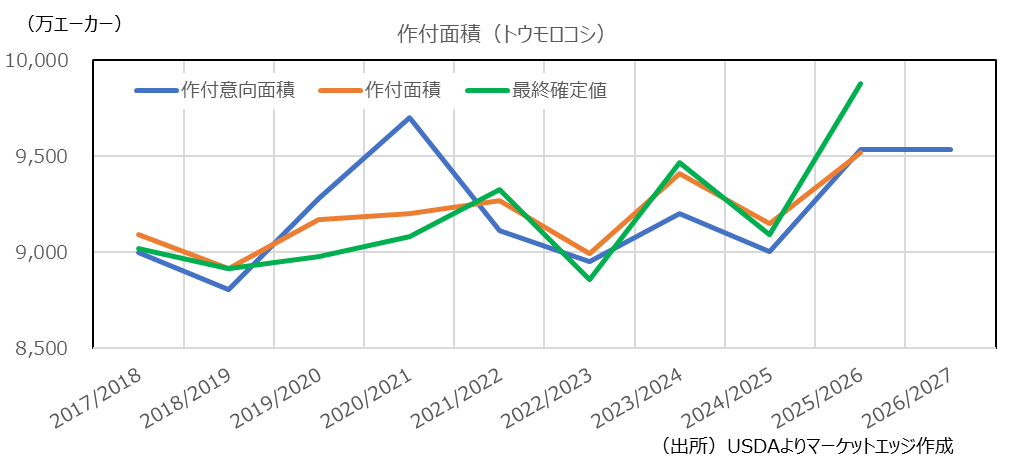 2026/27年度の作付面積見通しは、2月のアウトルック・フォーラム(展望会議)でも計算モデルによる予測値が示されていたが、同見通しではトウモロコシが9,400万エーカー、小麦が4,500万エーカー、大豆が8,500万エーカーとなっていた。これと比較すると、農家は想定されていたほどにはトウモロコシの作付面積削減に積極的ではなかったと言えよう。