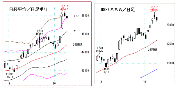 先日まで4日間で3400円も上げたのだから調整挟むのは当然で、46000円付近まではスピード調整という見方もできる。ただ、週明け6日に一時2380円高と急騰し、4月の安値期日(10/7)に高値48527円をつけ、そして日足チャートは陰線を2本引いてボリ「+2(本日47913円)」を割り込んだ。