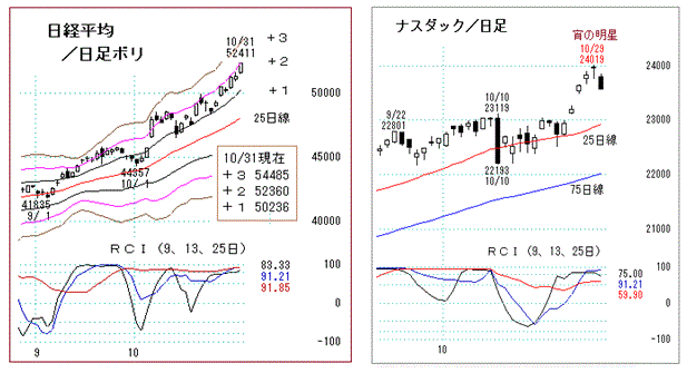 週末・月末にも係わらず、日経平均の勢いが止まらない。30日のナスダックが6日ぶりに下落したが、好決算を発表したアマゾンが時間外取引で13%上昇しており、それを背景に日経平均は3日続伸、1085円高52411円の高値引け。 日足チャートは短期トレンドをブレイクアウト(上振れ)、上昇するボリ「+2」(本日52360円)に沿った上値追いが続き、来週は「53000~54000円」を目指す可能性も出てきた。