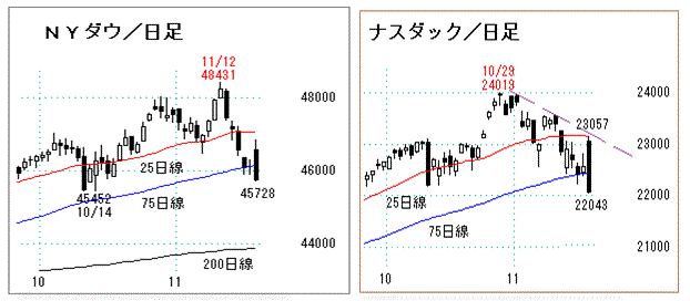 エヌビディアの好決算を背景に20日の米国株は上昇で始まった。だが、NYダウは朝方の717ドル高から一転、一時409ドル安と急落して45752-386ドルで終えた。ナスダックも583高から521安と急落して22078-486ポイント引け。エヌビディア株も朝方の高値196.0ドルから終値180.64-5.88ドル(-3.15%)と下落に転じた。