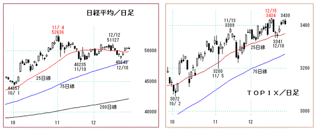 日経平均(本日68円安50344円)は25日線前後でもみ合うが、チャートは11/4高値52636円から調整続く。ここをスピード調整として上放れるのか、それとも75日線(同48385円)を割り込んで「二段下げ」に進むのか、それがチャートの焦点。