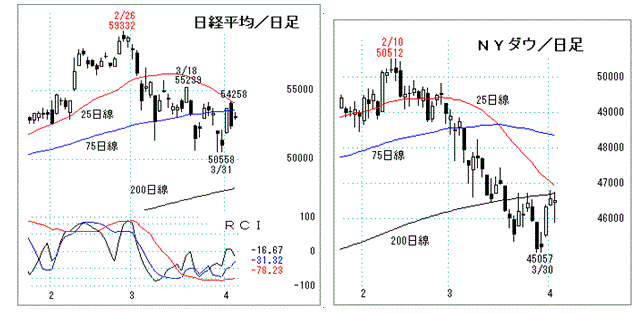 米国のNYダウ(2日46504-61ドル)も朝方668ドル安と下落したが、イランとオマーンがホルムズ海峡の船舶航行で協定文書を作成していると伝わり中東不安が少し後退、3連休(グッドフライデー)を控えて買い戻しを誘って下げ幅を縮めて終えた。ナスダック(21875+38ポイント)も一時469安と下げたが、切り返して3日続伸で終えた。ただ、日足チャートはどちらもデッドクロスする25日線と200日線に迫ったところでまだ好転の兆しは見られず、戻り正念場を迎えたところといえる。