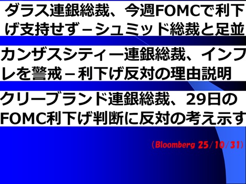 注目のFOMC。委員からの発言が複数伝わっています。利下げに慎重な意見も多く、今回投票権のない委員からは、「利下げを支持していない」という声も・・・過半数はインフレ懸念。手放しで利下げ賛成などは例の人物くらいでは?
