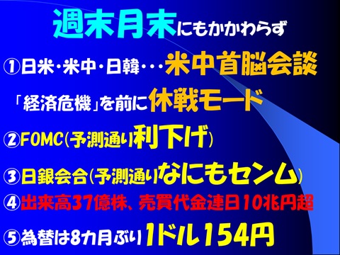 「円安ノンストップですね。FOMCで利下げが決まると、少しだけ円高。翌日、日銀金融政策決定会合で予測通りなにもセンムと決まると、円安転換。ま、予想通りの展開でしたね。