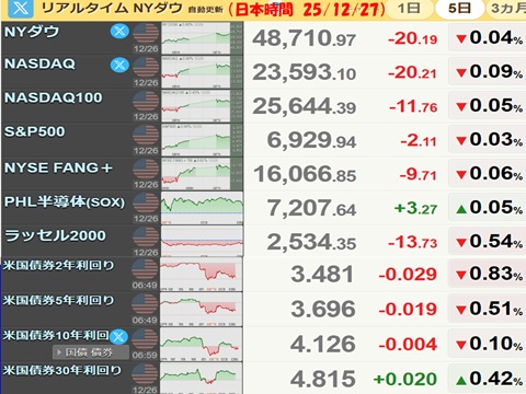 週末の米主要3指数は、6営業日ぶり反落。クリスマス、歳末相場で様子見の雰囲気。