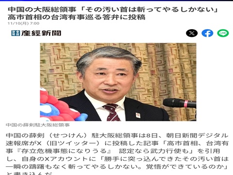 … … …(記事全文2,609文字)『高市首相のクビを斬ってやる!一国の代表に中国人外交官の暴言!どんなに化粧しても中国人の化けの皮が全面露出・・・傍若無人・我田引水・自画自賛・鉄面皮!チンピラを罷免せずかばって世界中から非難囂々!お人好しの日本人を怒らせますます嫌われるほど台湾びいきが増える!中国の外交官は習近平を失脚させたい?』
