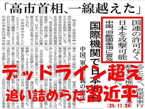 「高市総理 台湾有事 存立危機事態になりうる 武力攻撃の発生時」と大見出しが一面を飾り、そそっと中国に告げ口・・・従軍慰安婦事件とまったく同じ。