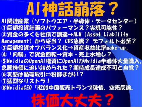 … … …(記事全文1,691文字)『AI神話の崩壊?儲かるの?OpenAI投資は大丈夫?中国のH200大型受注?国家の近接未来を賭けた産業革命のど真ん中?メガハイテクCEOたちが夢中になってるけど投資家の間に漂うシラケぶり!「引いたら終わり!止めたら破綻!」のキチンゲーム!銀行巻き込んでどこまで続く?最後は政府に救ってもらう?』