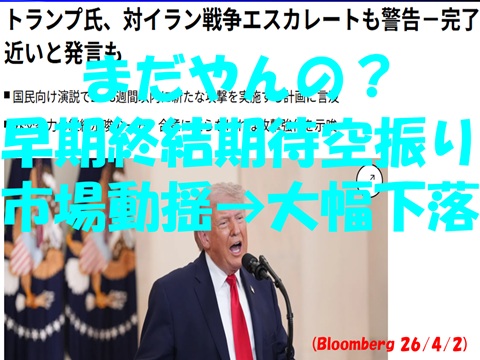 … … …(記事全文2,272文字)『48時間カウントダウンも終局!止めたいのはトラさんのほう!ベトナム、アフガン、ゲリラ戦で勝ったためしなし!米軍の地上戦投入はありえない!空母派遣は一斉退却のために!おいら、いち抜けた!あとは野となれ山となれ!さっさと停戦こそベスト!中間選挙勝利最優先!わが国安保にとってイラン戦はイラン!台湾有事向け戦力温存こそがキモ!今日はこのくらいにしといたるわ!池乃めだか師匠の捨て台詞で乗り切るしかない!』