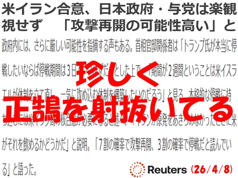 … … …(記事全文1,964文字)『90分前にギリ停戦合意!?全面妥協にもかかわらず強気の寅さんSNS!ノーサイド?勝者なし?いいえ三方一両損の大岡裁き!損失一両で済んでるうちが花!イラン体制転覆失敗!イス・イラとも停戦=次の戦争への準備タイム!さっさと降りて正解!NATO脱退も視野に入れたトラさん!加盟国30の宦官=無能大使が慌てて早苗さん詣で!日英同盟→4カ国→9カ国とテディに騙されて価値を希釈した大日本帝国!多けりゃいいってもんじゃない!』