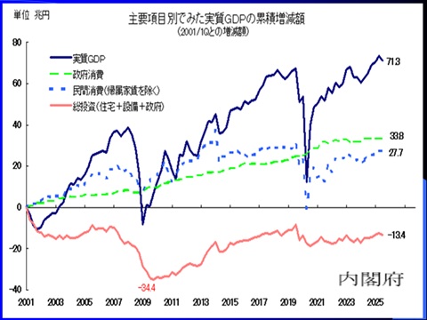 1政府消費が△34兆円。実は01年以降の実質GDP増=71兆円の半分が政府支出なのです。医療