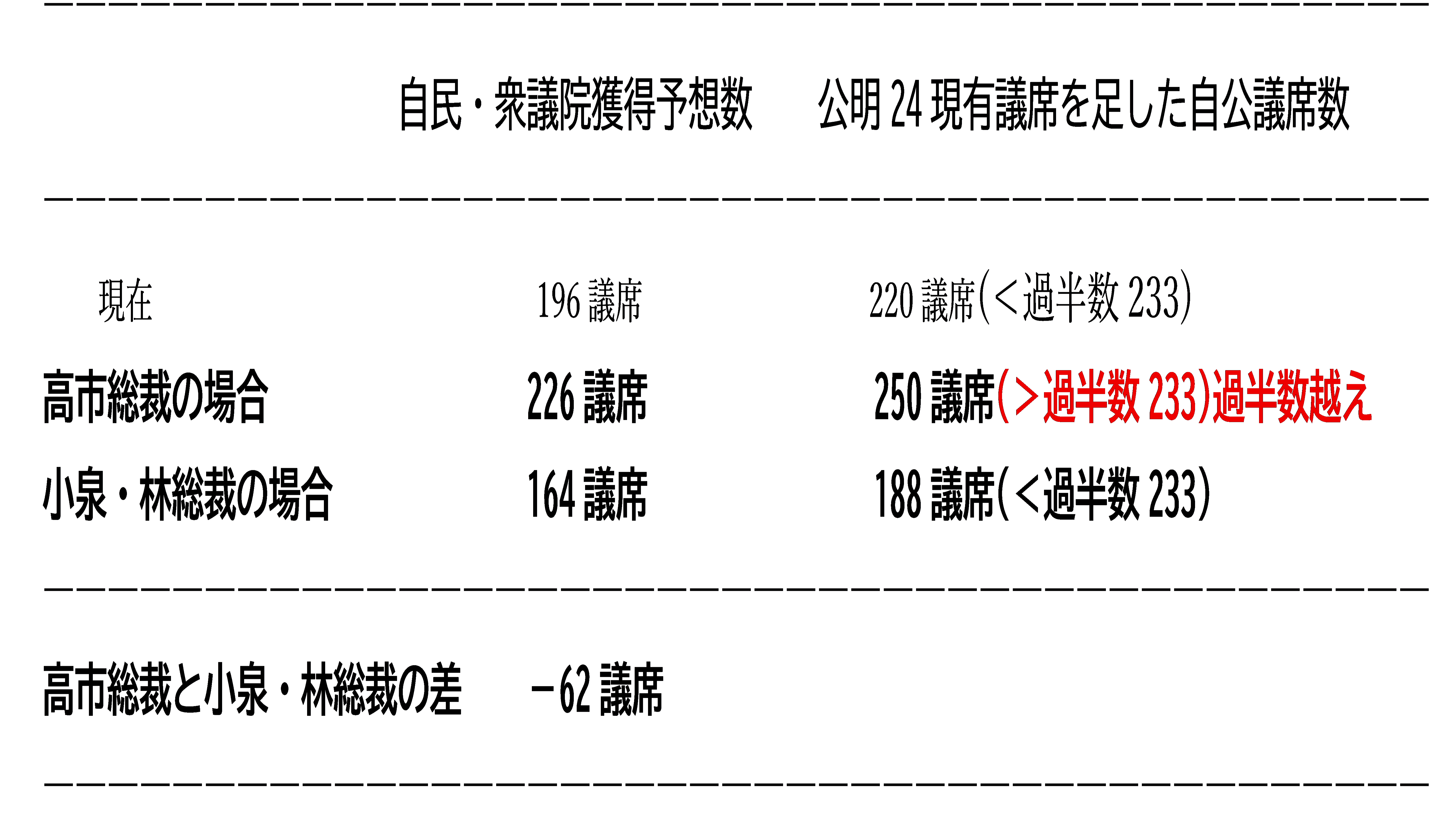 高市総裁と小泉・林総裁の差 -62議席