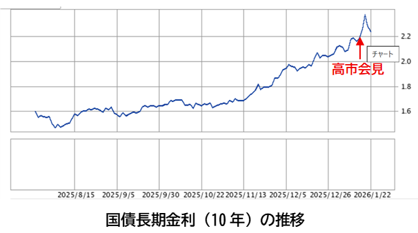 実際、長期金利のグラフを確認すると(↓)、高市会見(1月19日)の直後に金利が少々上昇しましたが、その後下落し、(植田利上げ後に実現している)「金利上昇トレンド」の範囲に収まっていることが分かります。