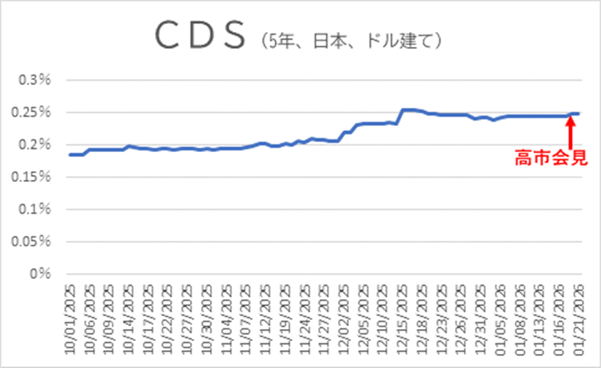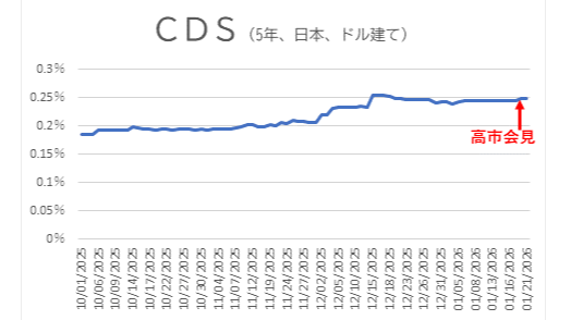 ところが、直近の日本国債5年CDSは、おおむね 0.24~0.25%(約25bp)前後でほぼ横ばいです。高市総理の積極財政発言の前後で、目立った上昇は全く起きていません。