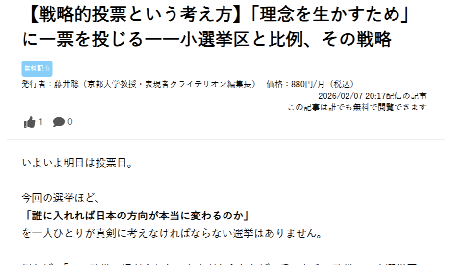 こうした“組み合わせ投票”こそ、一票の効果を最大化する現実的な方法だと思います。