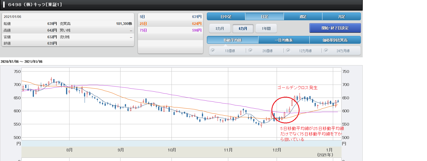 ////////////////////////////////////////////////////////////// 現物株のみ ~ 元手50万円で毎月たったの 2万円の投資で2000万円稼ぐ私の投資方法 https://foomii.com/00199 2021/1/10号 ////////////////////////////////////////////////////////////// 【チャートは先読みが大事】 目次 1.チャートは先読みが大事 2.チャートを読むときは投資家心理を考えましょう 3.今週の注目銘柄 1.チャートは先読みが大事 チャートを見る際に基本となるものとして、 移動平均線があります。 そして買いのポイントとして良く言われるも のが「ゴールデンクロス」です。 ゴールデンクロスとは、短期の移動平均線が 長期の移動平均線を下から上に抜ける現象を 言います。 参考にSMBC日興証券の「初めてでもわかり やすい用語集」の「ゴールデンクロス」に関 する説明のリンクを張っておきます ゴールデンクロス https://www.smbcnikko.co.jp/terms/japan/ko/J0051.html 実際のチャートを使って、例を以下に示しま す。 12/11に配信した臨時増刊号【業績では買え ないがDX関連銘柄と見れば買える】で紹介 したキッツを例にしたいと思います。 私は12/8にキッツ(6498)を608円で600 株買っていますが、その決め手は、事前にゴ ールデンクロスを予測できるようなシグナル があったからです。 キッツのチャート(12/8)上記は、12/11に解説した時のチャートです がキッツのチャートを見ると、短期の5日移 動平均線が中期の25日移動平均線を明確で はないものの、ほんの少し上抜けています。 もう一つ決め手になったのが、底打ち後、 12/7の日足が陽線で5日移動平均線と25 日移動平均線を抜いていたことです。 その後、明確なゴールデンクロスが発生し、 株価が上昇していきました。 キッツのチャート