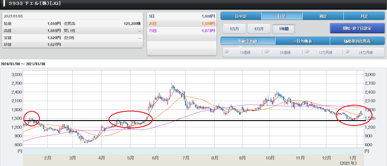 この時、「チャートを見ると2020年月 1中旬の高値、4月下旬の高値1470円 近辺を抜けきれていなかったのですが、5月 下旬に、この高値抵抗ライン1470円近辺 を抜けてからは、この1470円近辺が下値 抵抗ラインになっているように見えます。 よって、下値抵抗ラインは1470円だと思 い、1471円で買いました。」と書きまし た。 このチャートも「過去の高値は現在の下値に なる」になっていることが確認できると思い ます。 これも、投資家心理の裏付けがあるからで す。 ちなみに、1/8のチエルの終値は1627円 でした。 チエルのチャート(1/8)