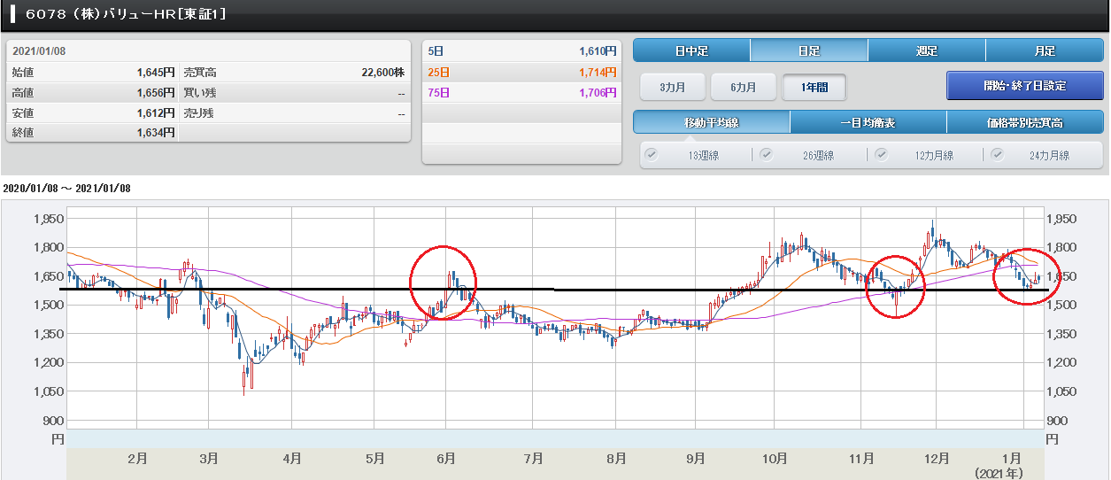 この時は、「昨年の6月高値が、現在の下値 抵抗ラインになっています。12/20号【知っ ておきたいチャートの法則】で紹介した『過 去の高値は、その後の下値抵抗ラインになる 』にあてはまると思われます。よって、下値 抵抗ラインは1580円近辺と思われます」 と書きました。 1/8時点のバリューHRの終値は1634円 でした。 バリューHRのチャート(1/8)