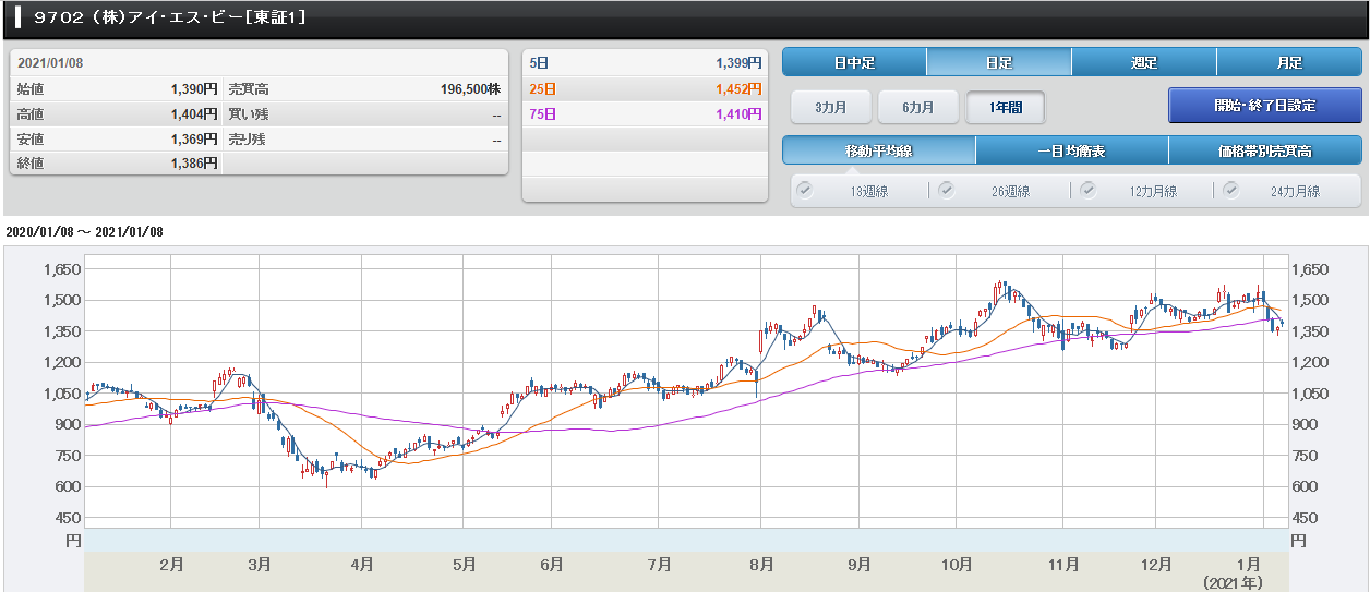 以前、投資初心者や投資歴が浅い人は、値動 きを良く見ましょう、と書いたことがありま す。 チャートを見ることは、値動きのクセを見出 すためには絶対必要だと思います。 チャートを何千回と見て、その人独自の「気 づき」を得て、自分の感覚を磨きながら精度 を上げていくしか、株式投資で長く儲ける方 法はないと思います。 もし、株式投資の勝ち方を掴みたいなら、課 題そのものを自分で見つけて解決していく 「考えられる頭」を作るよう努力するべきで す。 そこで考えるヒントは、何か?と言ったら、 「投資家心理」です。 このチャートの形だったら、他の投資家は、 どのように考えるか?を考えてみることで す。 考えるためには、まずは、何に対しても鵜呑 みにせずに、自分の頭で考えることです。 なぜ、チャートが何故そのような動きをする のかは、投資家心理と密接な関わりがあるの です。 4.今週の注目銘柄 アイ・エス・ビー(9702)に注目したいと思い ます。 1/8の終値は1386円です。 アイ・エス・ビーのチャート
