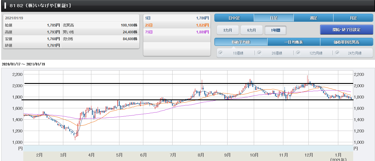 ////////////////////////////////////////////////////////////// 現物株のみ ~ 元手50万円で毎月たったの 2万円の投資で2000万円稼ぐ私の投資方法 https://foomii.com/00199 2021/1/20 臨時増刊号 その1 ////////////////////////////////////////////////////////////// 臨時増刊号【今日買った銘柄】1月20日 その1 今日(1/20)は、いなげや(3539)を 1755円で100株買いました。 今日の終値は1768円(+7円)でした。 いなげやは、以下の店舗を展開している総合 小売り、食品小売り企業です。 ・いなげや ・ina21(Everyday Low Price店舗) ・blooming bloomy (高質形式の店舗) ・ESBI(低価格志向の小型店舗) また、関係会社としては、ドラッグストア のウェルパーク(Welpark)を傘下に持って います。 1.業績が好調 2020/11/4に発表された2021年3月期 第2四半期決算は、増収・増益でした。 売上高が1368億2100万円(前年同期 比8.4%増)、営業利益が46億3500 万円(前年同期は1億9900万円の赤字) 、経常利益が47億5700万円(前年同期 は6300万円の赤字)、純利益が31億 5500万円(前年同期は2億7300万円 の赤字)でした。 なお、今回の第2四半期決算発表時に通期 業績予想の上方修正を行っています。 通期の業績予想は増収・増益となっていま す。 売上高が2610億円(前年比2.6%増) 、営業利益が60億円(前年比157.6% 増)、経常利益が62億円(前年比136. 4%増)、純利益が35億円(前年比410 .5%増)となっています。 第2四半期までの好成績は、新型コロナ感染 症拡大による内食需要の増加により、スーパ ーマーケット事業の業績伸長によるもので、 今後も新型コロナ感染症による内食需要は旺 盛だと思われます。 今後も好調な業績を保っていくものと思いま す。 2.チャートから考える 以下の画像を参照してください。 いなげやのチャートチャートを見ると9月以降から現在にかけて 1760円から2000円のボックス圏で動 いているように見えます。 昨日も書きましたが、チャートがボックス圏 の動きになる理由としては、新たな材料が出 てくるまでは、上昇、または下落トレンドの 方向性を市場参加者が見極めている状況だか らと言えます。 要するに、ファンダメンタルが変わらない場 合において、新たな成長に向けた材料や好業 績に導くような材料などが出てくるまで、上 下を繰り返しながら、材料を待っているとい う状況だと言えます。 ちなみに、2021年3月期第3四半期決算 が2/2に発表される予定です。 今後、1760円近辺でもみ合うことが予想 されるのですが、2/2の決算発表に向かって、 一旦、上昇すると思います。 このワンチャンスを狙えば、短期的な値幅が 取れると思い買いました。しかし、決算跨ぎ は避けたいと思います。 筆者 よっちゃん(個人投資家) 筆者のブログ https://ameblo.jp/tatisan825/ ////////////////////////////////////////////////////////////// 本ウェブマガジンに対するご意見、ご感想は 、このメールアドレス宛に返信をお願いいた します。 8872gsmi@jcom.zaq.ne.jp ////////////////////////////////////////////////////////////// 著者への取材依頼・お問い合わせは、下記ア ドレスのお問合せフォームにてお願いします。 https://foomii.com/cmm/mm/offers/ ////////////////////////////////////////////////////////////// ■ ウェブマガジンの購読や課金に関するお 問い合わせはこちら info@foomii.com ■ 配信停止はこちらから: https://foomii.com/mypage/ ////////////////////////////////////////////////////////////// 本メールマガジンのご利用について ・本メールマガジンは投資一般に関する情報 提供を目的としたものです。 ・本メールマガジンは特定の商品の勧誘や売 買の推奨等を目的としたものではありませ ん。 ・本メールマガジンは特定銘柄および株式市 場全般の推奨や株価動向の上昇または下落を 示唆するものではありません。 ・本メールマガジンはいかなる内容も将来の 運用成果または投資収益を示唆あるいは保証 するものではありません。 ・最終的な投資決定はご購読者様ご自身の判 断でなさるようにお願いします。 //////////////////////////////////////////////////////////////