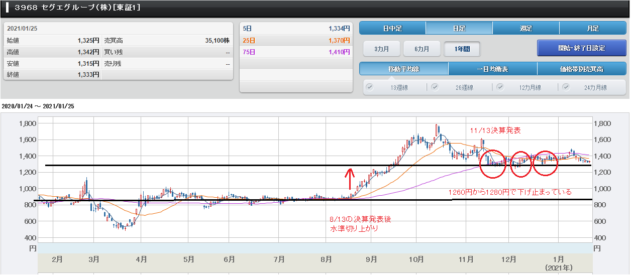 ////////////////////////////////////////////////////////////// 現物株のみ ~ 元手50万円で毎月たったの 2万円の投資で2000万円稼ぐ私の投資方法 https://foomii.com/00199 2021/1/26 臨時増刊号 ////////////////////////////////////////////////////////////// 臨時増刊号【今日買った銘柄】1月26日 今日(1/26)は、セグエグループ(3968)を 1296円で100株買いました。 セグエグループの終値は11円安の1322円で した。 セグエグループは、ITシステムにおけるIT インフラ及びネットワークセキュリティ製 品に係る設計、販売、構築、運用、保守サー ビスを一貫して提供する「ITソリューショ ン事業」を展開する各社の管理会社です。 業績は、以下のように堅調に推移しているそ うです。 ・海外プロダクトの販売が堅調、安定して 売上総利益を確保 ・GIGAスクール案件の獲得が進む ・テレワーク関連プロダクトの販売が堅調に 推移 ・サポートサービス等のサービス販売が堅調 に推移 特に、テレワーク関連プロダクトの販売進捗 により売上高、売上総利益率・額全て過去最 高値を更新しているそうです。 1.業績が期待できる 2020/11/13に発表された2020年12月期 第3四半期決算は、増収・増益でした。 売上高が75億4600万円(前年同期比2 .3%増)、営業利益が4億4200万円 (前年同期比0.9%増)、経常利益が4億 6400万円(前年同期比5.6%増)、純 利益が3億5400万円(前年同期比24. 0増)でした。 なお、通期業績予想も、増収・増益を予想し ています。 売上高が110億1200万円(前年比 14.2増)、営業利益が5億8100万円 (前年比6.0%増)、経常利益が5億90 00万円(前年比7.2%増)、純利益が4 億3600万円(前年比6.1増)を予想し ています。 なお、2/12 16:00に2020年12月期本 決算が発表される予定です。 来期もテレワーク需要の増大により、テレワ ーク関連プロダクトの販売が堅調に推移し、 業績を引っ張っていくものと思います。 2.買値目途について 以下の画像を参照してください。 セグエグループのチャートチャートを見ると、8/13の第2四半期決算 発表を受けて明確に水準が切り上がっている ことが確認できます。 8/13以前は860円でもみ合っていたのですが 、8/13以降に上昇しています。 しかし、11/13の第3四半期決算を境に1260 円から1280円を下値に揉み合っていることが 確認できます。 よって、下値目途は1280円と考え、1300円 を割ったら速攻で買おうと待ち構えていまし た。 10月中旬の高値は11/13の決算期待で上昇 していたものと思われます。そして、11/13 の第3四半期決算で材料出尽くしで、一旦、 売られたものと思います。 おそらく、ここから、2/12に発表される本決 算と来期見通しを期待して上昇していくもの と思います。 しかし、2/12の決算発表で一旦、売られるも のと思いますので、決算跨ぎは要注意です。 筆者 よっちゃん(個人投資家) 筆者のブログ https://ameblo.jp/tatisan825/ ////////////////////////////////////////////////////////////// 本ウェブマガジンに対するご意見、ご感想は 、このメールアドレス宛に返信をお願いいた します。 8872gsmi@jcom.zaq.ne.jp ////////////////////////////////////////////////////////////// 著者への取材依頼・お問い合わせは、下記ア ドレスのお問合せフォームにてお願いします。 https://foomii.com/cmm/mm/offers/ ////////////////////////////////////////////////////////////// ■ ウェブマガジンの購読や課金に関するお 問い合わせはこちら info@foomii.com ■ 配信停止はこちらから: https://foomii.com/mypage/ ////////////////////////////////////////////////////////////// 本メールマガジンのご利用について ・本メールマガジンは投資一般に関する情報 提供を目的としたものです。 ・本メールマガジンは特定の商品の勧誘や売 買の推奨等を目的としたものではありませ ん。 ・本メールマガジンは特定銘柄および株式市 場全般の推奨や株価動向の上昇または下落を 示唆するものではありません。 ・本メールマガジンはいかなる内容も将来の 運用成果または投資収益を示唆あるいは保証 するものではありません。 ・最終的な投資決定はご購読者様ご自身の判 断でなさるようにお願いします。 //////////////////////////////////////////////////////////////