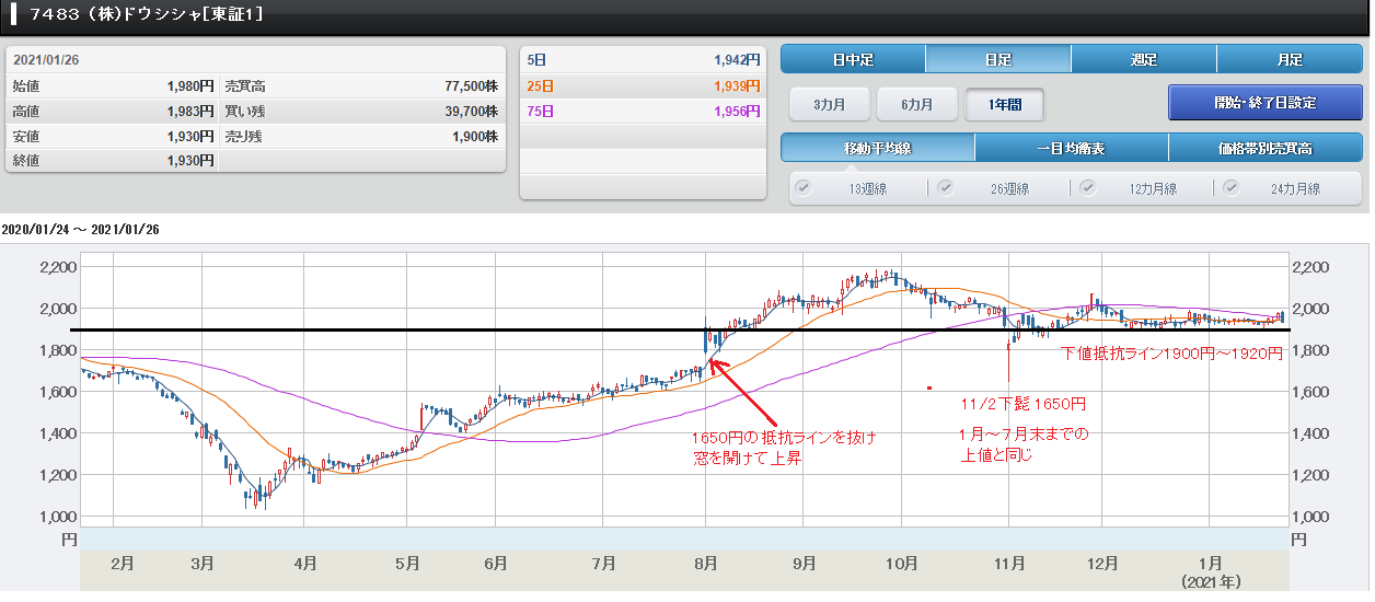 ////////////////////////////////////////////////////////////// 現物株のみ ~ 元手50万円で毎月たったの 2万円の投資で2000万円稼ぐ私の投資方法 https://foomii.com/00199 2021/1/27 臨時増刊号 ////////////////////////////////////////////////////////////// 臨時増刊号【今日買った銘柄】1月27日 今日(1/27)は、ドウシシャ(7483)を 1910円で100株買いました。 ドウシシャの終値は13円安の1917円でした。 ドウシシャは、大阪府と東京都に本社を置く プライベートブランド商品の企画・開発・ 販売、ナショナルブランド商品の仕入・販売 、小売支援サービスを中心とした「流通サー ビス業」を営む企業です。 最近は、在宅勤務・テレワーク需要の拡大に より、OAデスクやOAチェアーの販売が好 調に推移しているそうです。 また、家電関連では、室内環境を改善するた め、扇風機やサーキュレーターの販売が好調 に推移し、さらに家庭内での調理機会が高ま っていることから、ホットプレートなどの調 理家電の販売が好調に推移しているそうで す。 その他、除菌スプレーやマスク、ビニール手 袋等の衛生関連用品の販売が好調に推移して いるそうです。 1.業績が期待できる 2020/10/30に発表された2021年3月期 第2四半期決算は、増収・増益でした。 売上高が501億8900万円(前年同期比 3.9%増)、営業利益が52億300万円 (前年同期比66.5%増)、経常利益が 53億2200万円(前年同期比68.6% 増)、純利益が35億8600万円(前年同 期比67.7増)でした。 また、通期業績予想も増収・増益を予想して います。上昇修正の発表を行ったのですが、 期待値が高かったのか、翌営業日の11/2に 1650円まで売り込まれました。 通期業績予想については、売上高が1010 億円(前年比4.9増)、営業利益が86億 円(前年比43.4%増)、経常利益が88 億円(前年比40.6%増)、純利益が59 億円(前年比40.1%増)を予想していま す。 なお、1/29 15:00に2021年3月期第3 四半期決算が発表される予定です。 この決算で、期末配当を増額してくることを 期待しています。 2.買値目途について 以下の画像を参照してください。 ドウシシャのチャートチャートを見ると、10/30の第2四半期決算 発表後、下値抵抗ライン1900円から1920円 で動いているように見えます。 7/31の第1四半期決算発表前までは1650円 が上値抵抗ラインに見えます。 しかし、第1四半期決算発表を受けて、 1650円の上値抵抗ラインを窓を開けて抜け 8月以降は明確に水準が切り上がって、下 値抵抗ライン1900円から1920円で動いてい るように見えます。 しかし、第2四半期決算発表後の11/2に長 い下髭がついていることが確認できます。 この日は最安値1650円をつけているのです が、面白いことに以前の上値抵抗ライン 1650円で止まっているのです。 おそらく、1/29に発表される第3四半期決 算発表までは、現在の水準で推移していくも のと思います。 1/29の決算発表は、ほぼ無風で終わると思 います。 私は、配当の増額を期待して待つことしたい と思います。 もし、無風で終わっても、ドウシシャの株主 優待でもらった手延べそうめんが気に入って いるので、3月末の株主優待を楽しみにした いと思います。 筆者 よっちゃん(個人投資家) 筆者のブログ https://ameblo.jp/tatisan825/ ////////////////////////////////////////////////////////////// 本ウェブマガジンに対するご意見、ご感想は 、このメールアドレス宛に返信をお願いいた します。 8872gsmi@jcom.zaq.ne.jp ////////////////////////////////////////////////////////////// 著者への取材依頼・お問い合わせは、下記ア ドレスのお問合せフォームにてお願いします。 https://foomii.com/cmm/mm/offers/ ////////////////////////////////////////////////////////////// ■ ウェブマガジンの購読や課金に関するお 問い合わせはこちら info@foomii.com ■ 配信停止はこちらから: https://foomii.com/mypage/ ////////////////////////////////////////////////////////////// 本メールマガジンのご利用について ・本メールマガジンは投資一般に関する情報 提供を目的としたものです。 ・本メールマガジンは特定の商品の勧誘や売 買の推奨等を目的としたものではありませ ん。 ・本メールマガジンは特定銘柄および株式市 場全般の推奨や株価動向の上昇または下落を 示唆するものではありません。 ・本メールマガジンはいかなる内容も将来の 運用成果または投資収益を示唆あるいは保証 するものではありません。 ・最終的な投資決定はご購読者様ご自身の判 断でなさるようにお願いします。 //////////////////////////////////////////////////////////////