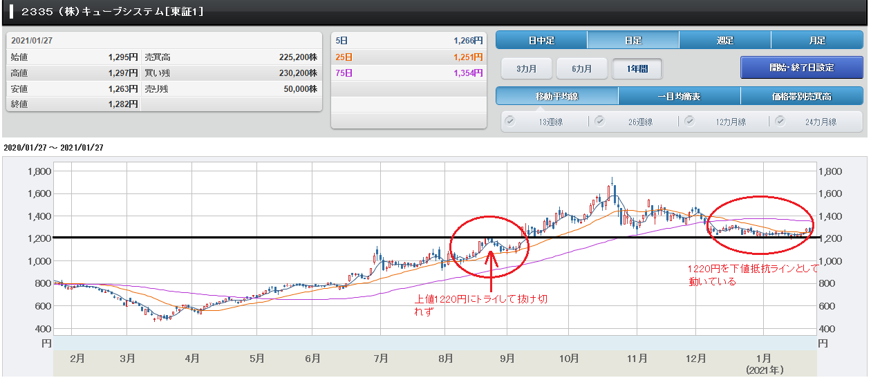 ////////////////////////////////////////////////////////////// 現物株のみ ~ 元手50万円で毎月たったの 2万円の投資で2000万円稼ぐ私の投資方法 https://foomii.com/00199 2021/1/28 臨時増刊号 その3 ////////////////////////////////////////////////////////////// 臨時増刊号【今日買った銘柄】1月28日 その3 今日(1/28)は、キューブシステム(2335)を 1215円で200株買いました。 キューブシステムの終値は51円安の1231円 でした。 キューブシステムは、ビジネスの拡大・効率 化するための業務アプリケーションシステム や、それを支える基盤システムについて、ソ リューション・サービスを提供している企業 です。 総合スーパー(流通)、銀行(金融)、携帯 電話会社(通信)、プライベートクラウドサ ービス(インフラ)へのサービスを提供して います。 今後のデジタルトランスフォーメーション (DX)関連ニーズの高まりを追い風として 、業績の拡大が期待できるものと思います。 1.業績が期待できる 2021/1/27に発表された2021年3月期第 3四半期決算は、増収・増益でした。 売上高が105億9100万円(前年同期比 0.5%増)、営業利益が7億9200万円 (前年同期比28.2%増)、経常利益が 9億2200万円(前年同期比46.8%増 )、純利益が5億9600万円(前年同期比 51.8%増)でした。 2021年3月期通期業績予想も増収・増 益を予想しています。 売上高が160億円(前年比8.8%増)、 営業利益が11億2000万円(前年比 16.8%増)、経常利益が11億2000 万円(前年比14.7%増)、純利益が7億 円(前年比33.3%増)を予想していま す。 なお、昨日、第3四半期決算が発表され、好 決算だったものの、大きく売られましたが、 チャートを見ても、大きく上昇していないこ とから、単に、相場の状況に引きずられたも のと思います。 おそらく、今後は上昇トレンドを維持してい くものと思います。 2.買値目途について 以下の画像を参照してください。 キューブシステムのチャートチャートを見ると、8月下旬に上値抵抗ライ ン1220円をトライして抜け切れませんでし た。 その後、9月中旬に上値抵抗ライン1220円 を抜けて、今現在は、1220円を下値対抗ラ インとして動いているように見えます。 下押ししても1220円までと思っていたところ 、1220円を一瞬抜けたので、1215円で買った 次第です。 筆者 よっちゃん(個人投資家) 筆者のブログ https://ameblo.jp/tatisan825/ ////////////////////////////////////////////////////////////// 本ウェブマガジンに対するご意見、ご感想は 、このメールアドレス宛に返信をお願いいた します。 8872gsmi@jcom.zaq.ne.jp ////////////////////////////////////////////////////////////// 著者への取材依頼・お問い合わせは、下記ア ドレスのお問合せフォームにてお願いします。 https://foomii.com/cmm/mm/offers/ ////////////////////////////////////////////////////////////// ■ ウェブマガジンの購読や課金に関するお 問い合わせはこちら info@foomii.com ■ 配信停止はこちらから: https://foomii.com/mypage/ ////////////////////////////////////////////////////////////// 本メールマガジンのご利用について ・本メールマガジンは投資一般に関する情報 提供を目的としたものです。 ・本メールマガジンは特定の商品の勧誘や売 買の推奨等を目的としたものではありませ ん。 ・本メールマガジンは特定銘柄および株式市 場全般の推奨や株価動向の上昇または下落を 示唆するものではありません。 ・本メールマガジンはいかなる内容も将来の 運用成果または投資収益を示唆あるいは保証 するものではありません。 ・最終的な投資決定はご購読者様ご自身の判 断でなさるようにお願いします。 //////////////////////////////////////////////////////////////