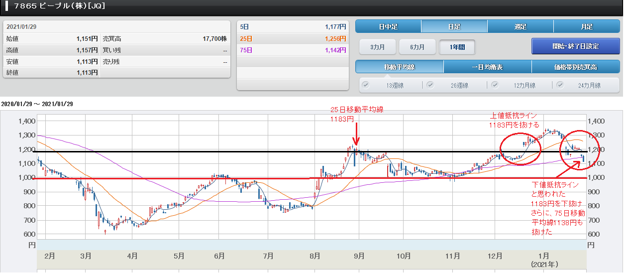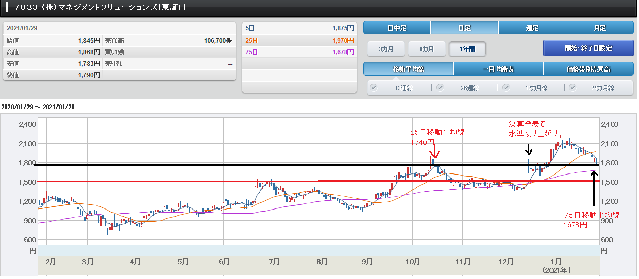 ////////////////////////////////////////////////////////////// 現物株のみ ~ 元手50万円で毎月たったの 2万円の投資で2000万円稼ぐ私の投資方法 https://foomii.com/00199 2021/1/31 臨時増刊号 ////////////////////////////////////////////////////////////// 臨時増刊号【今狙い目の銘柄】1月31日 先週末の株式市場は、ほぼ総崩れだったので すが、大幅に下落した銘柄の中に、今だから 買える銘柄が見つかりました。 今日は、今狙い目の2銘柄について紹介した いと思います。 1.マネジメントソリューションズ(7033) マネジメントソリューションズは、マネジ メント専門会社としてコンサルティングか ら現場への支援まで行う実行支援型のコン サルタント集団です。 マネジメント専門会社として経営層から現 場まで幅広く支援を行っています。 近年は、多くの企業でデジタルトランスフ ォーメーション(DX)に取り組んでいま すが、実際には導入に難儀している企業が 多いのが現状です。 マネジメントソリューションズは、クライ ンアント企業の課題に応じて、デジタルト ランスフォーメーション(DX)を導入す るためのソリューションを提供していま す。 今後も、デジタルトランスフォーメーショ ン(DX)の社内変革のニーズは引き続き 堅調に推移し、マネジメントソリューショ ンズの業績に寄与するものと思います。 なお、マネジメントソリューションズの先 週末(1/29)の終値は、67円安い1790円で した。 1.1 来期業績が期待できる 2020/12/14に発表された2020年10月期 本決算は、増収・減益でした。 売上高が52億2800万円(前年比34. 2%増)、営業利益が2億200万円(前年 比55.0%減)、経常利益が2億300万 円(前年比52.6%減)、純利益が120 0万円の赤字(前年は2億9200万円の黒 字)でした。 2021年10月期通期業績予想は増収・増 益を予想しています。 売上高が73億2000万円(前年比40. 0%増)、営業利益が8億5000万円(前 年比320.3%増)、経常利益が8億46 00万円(前年比315.4%増)、純利益 が5億8600円(前年は1200万円の赤 字)を予想しています。 前年の減収要因が、本社移転費用や採用活動 によるコスト増ですので、これらの要因が縮 小することから減益リスクは低いと思いま す。 1.2 買値目途について 以下の画像を参照してください。 マネジメントソリューションズのチャートまず、10月中旬と12/14の決算発表後の チャートの動きを見てください。 12/14決算発表後、10月中旬に抜けきれな かった上値抵抗ライン1740円を抜けている ことが確認できると思います。 よって、下値目途は1740円だと思います ので、1750円を割れば速攻で買いたいと 思います。 もし、1740円を割れた場合は、75日移 動平均線1678円が下値と思いますので、 この下値1678円に近くなったらナンピン したいと思います。 注)上値抵抗ライン1740円を抜けなかった 10月中旬以降、上値抵抗ラインが以前の 1500円に戻っていることが確認できると思 います。万が一、下押しした場合でも、こ の1500円が岩盤になると思います。 2.ピープル(7865) ピープルは、知育玩具、ベビー玩具、自転車 、ジャングルジム等の乳幼児玩具メーカーで す。 空間認識力を育てる知育玩具「ピタゴラスシ リーズ」が「ひらめきのプレート」を中心に 好調に推移しているそうです。 ピタゴラスシリーズ https://www.people-kk.co.jp/toys/pythagoras/lineup.html また、海外販売については、アメリカ向け以 外にも中国・アジア向け製品も増加が見受け られ順調に推移しているそうです。 今後も巣ごもり需要の増加を受けて屋内玩具 が好調に推移していくものと思います。 なお、ピープルの先週末(1/29)の終値は、 41円安い1113円でした。 2.1 業績が期待できる 2020/12/3に発表された2021年1月期第 3四半期決算は、増収・増益でした。 売上高が31億5600万円(前年同期比 13.2%増)、営業利益が3億2700万 円(前年同期比40.2%増)、経常利益が 3億1400万円(前年同期比38.3%増 )、純利益が2億1800万円(前年同期比 41.0%増)でした。 2021年1月期通期業績予想は増収・増益 を予想しています。 売上高が44億3500万円(前年比18. 3%増)、営業利益が3億6800万円(前 年比325.6%増)、経常利益が3億55 00万円(前年比23.8%増)、純利益が 2億3100円(前年同期比3.7%増)を 予想しています。 なお、2020/12/17に、期末配当が前年の 1株38円から50円~60円になりそうだ という発表をしています。 2022年1月期も同額の配当が行われる可 能性が高いと思われます。 配当利回りは4.49%~5.39%となり 高利回りも魅力的だと思います。 2.2 買値目途について 以下の画像を参照してください。 ピープルのチャート