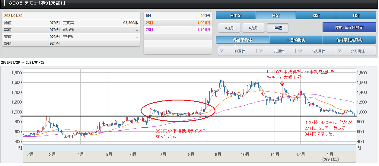 ////////////////////////////////////////////////////////////// 現物株のみ ~ 元手50万円で毎月たったの 2万円の投資で2000万円稼ぐ私の投資方法 https://foomii.com/00199 2021/2/1 臨時増刊号 ////////////////////////////////////////////////////////////// 臨時増刊号【今日買った銘柄】2月1日 今日(2/1)は、テモナ(3985)を921円で 100株買いました。 テモナの終値は20円高の944円でした。 テモナは、サブスクリプションビジネスに特 化したECサイトの導入、構築、運用等のサ ポートを行っています。 顧客は、テモナのショッピングカートシステ ム「サブスクストア」を導入することにより 、サブスクリプションビジネスに特化した ECサイトを簡単に運用できるようになりま す。 ECサイト構築で、壁になるのが代金の請求 ・入金管理です。特に、クレジットカードを 使えるようにするには、セキュリティ的な問 題から様々な規制があるので、簡単にクレジ ットカードを使えるようなシステムを独自で 簡単に構築できません。 また、以下の様々な決済にも対応しなくては ならないので、簡単に対応できません。 ・コンビニ決済 ・キャリア決済 ・ID決済 ・後払い決済 ・銀行振込決済 ・代金引換 テモナのショッピングカートシステムは、上 記の決済にも対応しているそうです。 最近は、定額の料金を支払うことで、製品や サービスを一定期間利用することができるサ ブスクリプション型のビジネスが流行してい ます。 今後、このサブスクリプション型ビジネスを 導入する企業が増加してくるものと思われま すので、テモナのショッピングカートシステ ムを導入する企業は増えていくものと思いま す。 今後の業績の拡大が期待できると思います。 1.業績が期待できる 2020/11/10に発表された2021年9月期 本決算については、増収となっています。 同時に発表された2021年9月期通期業績 予想については、増収・増益を予定していま す。 売上高が29億1000万円(前年比26. 5%増)、営業利益が3億7800万円(前 年比112.4%増)、経常利益が3億49 00万円(前年比101.5%増)、純利益 が2億900万円(前年比112.7%増) を予想しています。 なお、2/12 16:00に2021年9月期第1 四半期決算が発表される予定です。 この決算で、増収・増益を発表してくること を予想しています。 2.買値目途について 以下の画像を参照してください。 テモナのチャートチャートを見ると、7月から8月中旬まで 下値抵抗ライン920円近辺でもみ合っていま した。 しかし、8/7の2020年9月期第3四半期 決算を好感して、急上昇しています。 その後、1200円から1600円のレンジ相場に なったのですが、11/10の本決算、および 来期見通しを好感して上昇したものの、直近 は、下値抵抗ライン920円に近づきました。 ここから反発すると思い、921円で買ったと いう次第です。 さて、2021/1/24号【狙っている4銘柄に ついて】で紹介した、以下の銘柄を買い ました。 ・テクノスジャパン(3666) 買値目途 650円割れ 買値 640円 株数 300株 2/1の終値 661円(+2) ・YE DIGITAL(2354) 買値目途 750円割れ 買値 747円 株数 200株 2/1の終値 771円(+24) ・メディカルシステムネットワーク(4350) 買値目途 620円割れ 買値 594円 株数 900株 2/1の終値 588円(+29) また、臨時増刊号【今狙い目の銘柄】 1月31日で紹介した、以下の銘柄も買い ました。 ・ピープル(7865) 買値目途 1138円割れ 買値 1112円 株数 100株 2/1の終値 1111円(-2) 筆者 よっちゃん(個人投資家) 筆者のブログ https://ameblo.jp/tatisan825/ ////////////////////////////////////////////////////////////// 本ウェブマガジンに対するご意見、ご感想は 、このメールアドレス宛に返信をお願いいた します。 8872gsmi@jcom.zaq.ne.jp ////////////////////////////////////////////////////////////// 著者への取材依頼・お問い合わせは、下記ア ドレスのお問合せフォームにてお願いします。 https://foomii.com/cmm/mm/offers/ ////////////////////////////////////////////////////////////// ■ ウェブマガジンの購読や課金に関するお 問い合わせはこちら info@foomii.com ■ 配信停止はこちらから: https://foomii.com/mypage/ ////////////////////////////////////////////////////////////// 本メールマガジンのご利用について ・本メールマガジンは投資一般に関する情報 提供を目的としたものです。 ・本メールマガジンは特定の商品の勧誘や売 買の推奨等を目的としたものではありませ ん。 ・本メールマガジンは特定銘柄および株式市 場全般の推奨や株価動向の上昇または下落を 示唆するものではありません。 ・本メールマガジンはいかなる内容も将来の 運用成果または投資収益を示唆あるいは保証 するものではありません。 ・最終的な投資決定はご購読者様ご自身の判 断でなさるようにお願いします。 //////////////////////////////////////////////////////////////