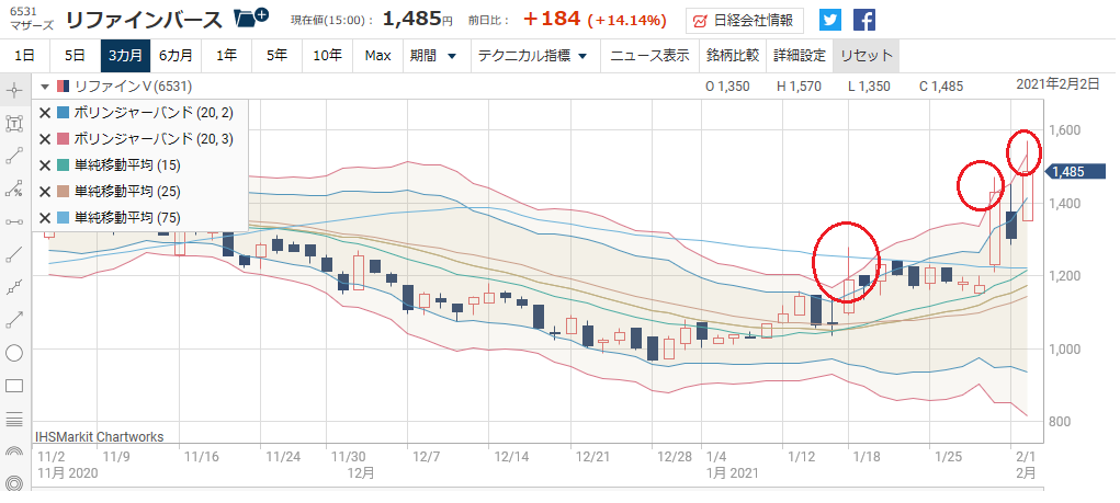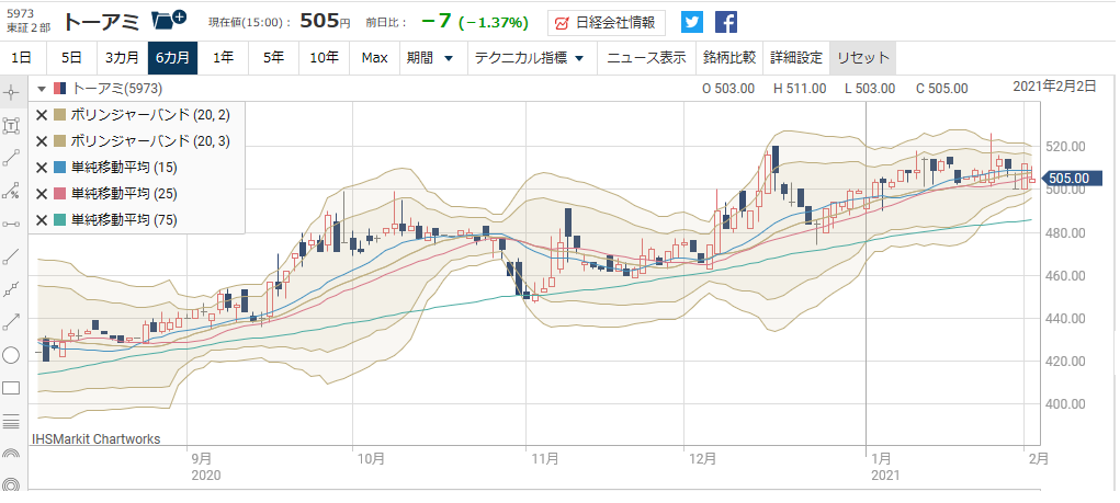 ////////////////////////////////////////////////////////////// 現物株のみ ~ 元手50万円で毎月たったの 2万円の投資で2000万円稼ぐ私の投資方法 https://foomii.com/00199 2021/2/7号 ////////////////////////////////////////////////////////////// 【チャートを見るときに注意すべき点】 目次 1.ボラティリティについて 2.ボリンジャーバンドについて 3.25日、75日移動平均線は調整の目途になる 4.25日、75日移動平均線を割った場合は買い場 5.今週の注目銘柄 以前より、チャートを見るときに注意すべき 点として、値動きのクセを見ましょう、と書 いてきました。 そこで、今回は、チャートを見る際に、知っ ておきたい注意すべき点について書きたいと 思います。 1.ボラティリティについて 良く「ボラティリティが大きい」と言われる ことがありますが、ボラティリティが大きい ほど、値動きの上下が激しいことを指しま す。 逆に「ボラティリティが小さい」場合は、値 動きの上下が緩やかであることを指します。 つまり、ボラティリティとは、株価の値動き の振幅度合いを指す言葉です。 さて、2021/1/17号【下値サポートラインを 意識しましょう】で「VIXショック」につ いて書きました。 VIXショックとは、2018年に起こった VIX指数の急上昇により暴落が起こった事 象のことですが、このVIX指数とは、ボラ ティリティ・インデックス(Volatility Index)のことを指します。 VIX指数は、シカゴ・オプション取引所が S&P500を対象とするオプション取引の 満期30日の予想変動率(インプライド・ボ ラティリティ)を元に算出し、1993年よ り公表している指数です。 VIX指数は、投資家が将来の変動をどのよ うに想定しているかを表した指数で、VIX 指数が大きくなるほど、投資家が将来の変動 幅が大きくなると予想をしていることを意味 し、将来に対する不安が高まっていることを 表します。 ところで、先ほども説明しましたが、株価の 値動きの振幅度合いが大きい場合、「ボラテ ィリティが大きい」、小さい場合は、「ボラ ティリティが小さい」と言います。 投資家には、様々な考え方を持った人がいま すが、私のように「あまり値動きが大きい銘 柄は勘弁して欲しい」と思っている人もいれ ば、「値動きが大きいほどいい」と思ってい る人もいます。 この「ボラティリティが大きい」銘柄を好む 人は一般的には、値動きの上下の振幅を利用 して、頻繁にトレードする人が多いと思いま す。 また、「ボラティリティが小さい」銘柄を好 む人は、のんびりとお茶でも飲みながら、株 式投資をする人が多いと思います よって、株価の値動きの振幅度合いを示す 「ボラティリティ」は、その銘柄のリスク度 合いを表すことになります。 「ボラティリティが大きい」銘柄は、ハイリ スク・ハイリターン、「ボラティリティが小 さい」銘柄は、ローリスク・ローリターンで あると一般的に言われています。 2.ボリンジャーバンドについて ボラティリティを特徴付けるものとして「ボ リンジャーバンド」というものがあります。 ボリンジャーバンドと株価を比較すると、そ の銘柄のボラティリティが確認できます。 ボリンジャーバンドは、移動平均線と、その 上下2本ずつの標準偏差からなる線の計5本 の線で表わされます。 基本的な考え方として、株価は移動平均線に そって動き、移動平均線からの乖離は、正規 分布に従うとして、統計学上、±2σ(σは 標準偏差)の間で動くであろうというもので す。 なお、±2σに収まる確率は95.45%で す。 では、先ほどのボラティリティが大きい銘柄 の代表例を示したいと思います。 例えば、東証マザーズ上場のリファインバー ス(6531)のチャートを見ると、一日だけでも 値幅が大きいことがわかると思います。 リファインバースのチャートさらに、上値がボリンジャーバンドの+2σ を上回っている個所が3箇所あります。 1日の値幅も大きく、ボラティリティが大き い銘柄であると言えると思います。 こういう銘柄は、デイトレードや、スイング トレードで値幅を取りに行く人には向いてい ると言えます。 しかし、その代わり、損するリスクが大きい 銘柄とも言えます。 また、このチャートから言えることは、リフ ァインバースを取引する投資家の性質として 、上値追いをする投資家が多いことを示して いると思います。 要するに、この銘柄を好む投資家は、リスク を厭わないギャンブラーが多いということで す。 逆に、ボラティリティが小さい銘柄の代表例 は、臨時増刊号【今日買った銘柄】 10月5日 その2(修正版)で紹介したトーア ミ(5973)です。 トーアミのチャート