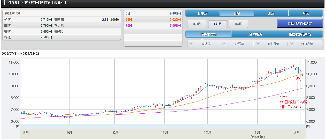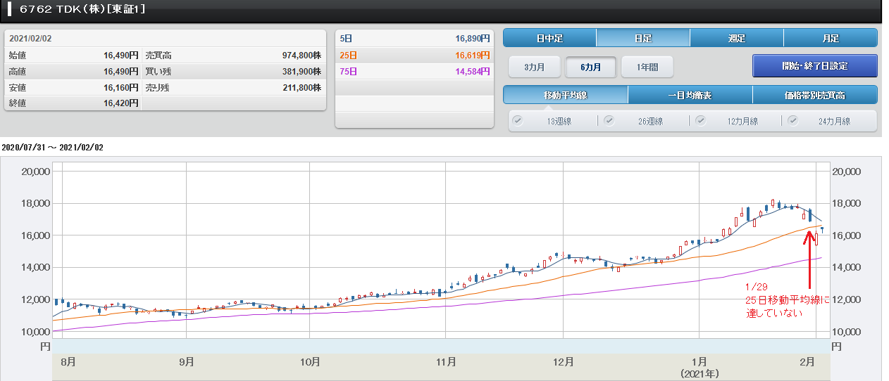 このエムスリーに対して、同じく1/29に好 決算を発表した村田製作所(6981)ですが、 2/1に大幅に下落しました。 もう一つ、同じく1/29に好決算を発表した TDK(6762)も2/1に大幅に下落しました。 村田製作所のチャートを見ると、1/29に大 幅に下落しているのですが、25日移動平均 線に達していないことが確認できると思いま す。 同じく、TDKのチャートを見ると、1/29 に大幅に下落しているのですが、25日移動 平均線に達していないことが確認できると思 います。 村田製作所のチャート