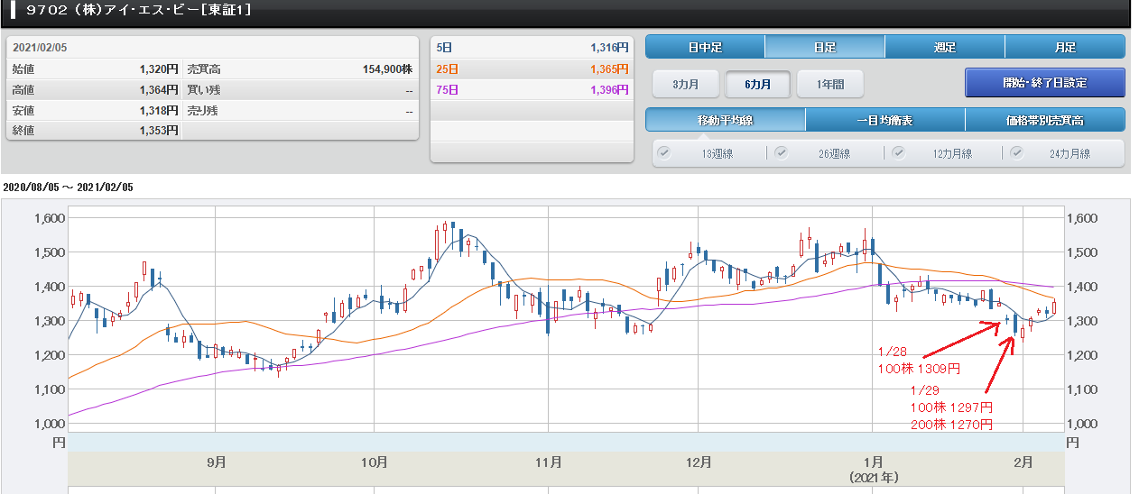 この時のチャートで検討した際、上昇トレン ドを保っていたことを確認し、さらに25日 移動平均線、75日移動平均線が下値サポー トラインとして機能していたことを確認しま した。 確かに、25日移動平均線、75日移動平均 線が下値サポートラインとして機能している のですが、11月下旬に75日移動平均線を 割っているのです。 つまり、アイ・エス・ビーは、25日移動平 均線、75日移動平均線を下値サポートライ ンとして動いていたものの、75日移動平均 線を割ることがある銘柄だ、という意識が必 要だということです。 そして、下げ過ぎだったのか直ぐに75日移 動平均線、25日移動平均線を上回りまし た。 つまり、この銘柄を取引する投資家は、諦め が早い投資家が多い、といえると思います。 要するに、アイ・エス・ビーのチャートから は、心理的節目である25日移動平均線、 75日移動平均線を割ったら、速攻で売りに 走る戦略を持った、ビビリな性格の投資家が 多いことをが伺えるのです。 他の銘柄を確認してもらえばわかるのですが 「25日移動平均線、75日移動平均線は絶 対に割らせないぞ!」と強固な意志を感じる 銘柄もあります。 買い方が「25日移動平均線、75日移動平 均線付近は絶対買いだ!」という戦略を持 ち、売り方に対抗する強気の性格を持ってい ると、こういう傾向が強いと思います。 このようにチャートには、銘柄毎に、取引す る投資家の戦略や性格が表れるのです。 つまり、銘柄毎に、取引する投資家の戦略や 性格を知ったうえで、どのような戦略を取る べきかを考えるべきです。 1月8日に400株を1394円で買ったこ とは、以前のメールマガジンで書いた通りで すが、私は、アイ・エス・ビーのナンピンを 繰り返し、先週末(2/5)現在で、取得価格が 1341円、保有株数が800株になってい ます。 1月8日に400株を1394円で買ったの ですが、さらに、400株追加でナンピンし たのです。 チャートを見ていただくと分かると思います が、1月8日以降に株価が、どんどん下がっ ていってしまったのです。 2/5現在のアイ・エス・ビーのチャート