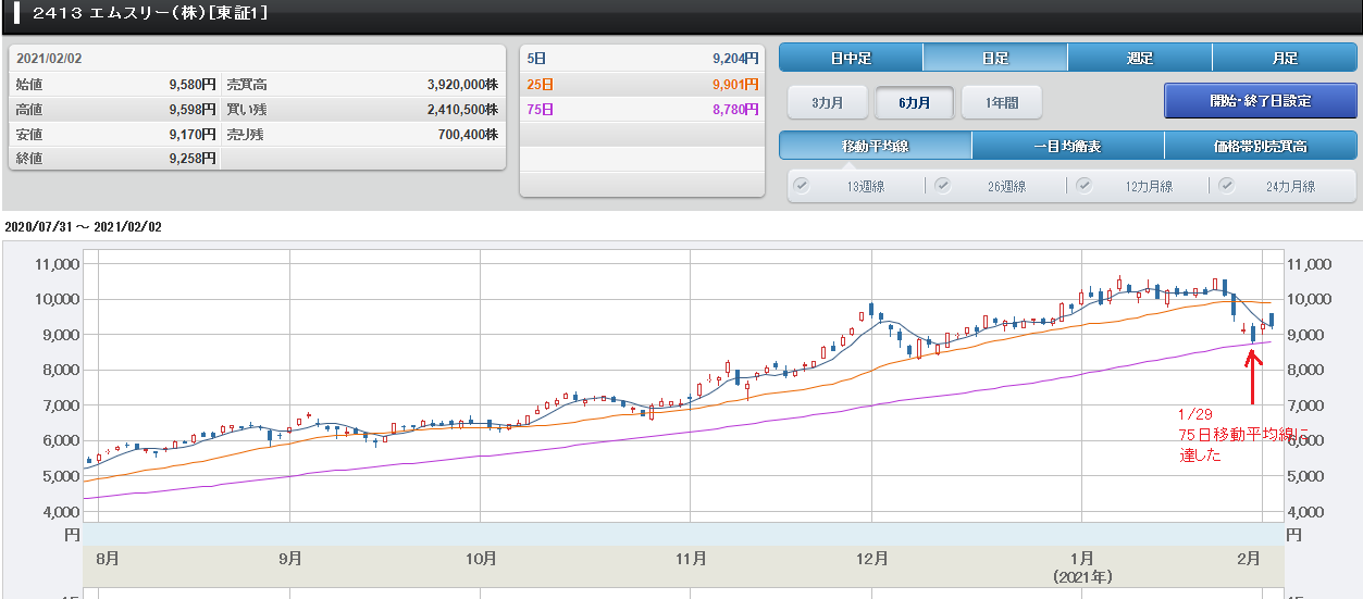 この銘柄は、ボリンジャーバンド±2σの間 で動いていることから、のんびりとお茶でも 飲みながら、株式投資ができると思います。 つまり、ボリンジャーバンド±2σの間で値 動きをしているか否かを確認することにより 「その銘柄のボラティリティの大きさ=リス クの大きさ」が確認できます。 まず、銘柄毎に、値動きの度合いに違いがあ ることを知ってください。 そして、ご自身が、取引しようとする銘柄の リスクの大きさを、予め知った上で、リスク を負ってでも取引するか、否か検討してくだ さい。 3.25日、75日移動平均線は調整の目途になる 2021/1/17号【下値サポートラインを意識 しましょう】で「上昇トレンド中の25日移 動平均線や75日移動平均線は下値サポート ラインになることが多い」と書きました。 つまり、株価が下がっても25日移動平均線 、または75日移動平均線で止まることが多 いということが言えると思います。 ブログでも書いたエムスリー(2413)ですが 1/29の大引け後に、好決算を発表したので すが、1/29に大幅下落し、75日移動平均 線で止まっていることが確認できます。 そして、好決算を好感して、2/1に大幅に上 昇しました。 エムスリーのチャート