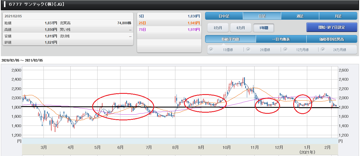 では、ナンピンを繰り返した時の戦略につい て書きたいと思います。 まず、株価が下がっていったときに次の下値 目途を1300円としました。 切りのいい数字は心理的節目になることが多 いのです。 そこで、1300円に近づいた1/28に 1309円で100株買いました。 しかし、1/29に、心理的節目と考えていた 1300円を割ったので、「これ以上は、下 がりすぎだろう」と考えました。 そして、1/29に1297円で100株を買 いましたが、その日のうちに、さらに下がっ たので1270円で200株買いました。 心理的節目の1300円を割ったときは焦り ましたが、結局は、下げ過ぎだったようで す。つまり、買い場だった、ということで す。 しかし、2/1の終値は上昇したのですが、 大底だったのですよね。さすがに、前日まで に400株追加で買っていたので、様子見を 決めました。 ここは、焦ってナンピンすると、スカピンに なると思い冷静に考えようと思った次第で す。 また、結果論ですが、「天井売れず 底買え ず」と言いますので、買いとしては、ほぼ、 良いところで買えたと思います。 2/1以降は、心理的節目の1300円以上の 株価が上昇していったので、もう、これ以上 は買う必要はないだろう、と買いはやめまし た。 そして、やっと、先週末に株価が1355円 となり、買値の1341円を超えてきました。 無暗なナンピンはスカピンになることが多い のですが、少なくとも、ナンピンが報われる か否かは、銘柄毎に取引する投資家の戦略や 性格を知ったうえで、ナンピンすべきだと思 います。 先ほど書いたように、アイ・エス・ビーを 取引する投資家は、早めに見切りをつける戦 略のビビリがが多いので、25日移動平均線 、75日移動平均線を割ったら、速攻で売り に走るということです。 そして、株価が上昇し始めると、買いに走り 、25日移動平均線、75日移動平均線を回 復するのも早い、ということです。 まず、チャートには、取引する投資家の戦略 や性格が表れますので、良くチャートを見て 、過去に25日移動平均線、および75日移 動平均線を大幅に下回っても、回復が早い銘 柄は、25日移動平均線、および75日移動 平均線を割った場合は、買い場として考えた いと思います。 アイ・エス・ビーは、そのうち25日移動平 均線、および75日移動平均線を回復するの は時間の問題だろうと思います。 今、1270円から1550円のボックス圏 で動いているように見えるので、目標は 1500円です。 なお、上記の例は、業績が良い、上昇トレン ド銘柄を対象にしています。 ダウントレンド銘柄を、逆張りで買う場合の お勧めの買い方については、8月から10月 に書いた定期配信のメールマガジンをお読み ください。 5.今週の注目銘柄 santec(6777)が、そろそろ買値目途に 近づいてきたので買いたいと狙っています。 santecは、光通信用部品、光測定器、 光画像センシングなどの光技術を応用した製 品を製造・販売している企業です。 2021年度3月期の上期は、製造現場向け 光学特性検査装置、及び眼科医療機器(光学 式眼内寸法測定装置)の販売が好調に推移し たそうです。 また、液晶プロジェクタ、液晶ディスプレイ 用の液晶素子の開発製造を行っています。 さらに、ゲームコントローラ用の加速度セン サー、携帯電話やPC用の小型マイク、プレ ゼンテーションで使用されるプロジェクタ用 の小型ミラーアレイに使われる微小電気機械 システムも製造しています。 注目すべき点としては、santecは5G 関連銘柄なのです。 基地局整備に絡み光モニターなどで高水準の 需要を取り込み、高収益が期待できると思い ます。 2021/1/29に発表された2021年3月期 第3四半期決算は増収・増益でした。 売上高が57億4900万円(前年同期比 20.0%増)、営業利益が12億円(前年 同期比42.5%増)、経常利益が12億9 900万円(前年同期比42.1%増)、純 利益が9億1800万円(前年同期比26. 2%増)でした。 なお、同時に2021年3月期通期業績予想 を上方修正し、増収・増益を予想していま す。 売上高が74億5000万円(前年比16. 7%増)、営業利益13億5000万円(前 年比44.2%増)、経常利益が14億50 00万円(前年比41.7%増)、純利益が 10億5000万円(前年比26.4%増) となっています。 santecのチャート