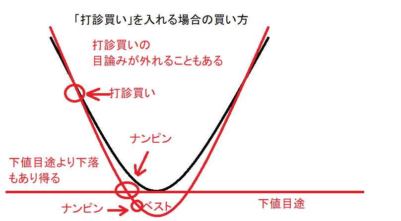 ところが、実際には、「打診買い」を入れた ものの、株価がさらに下落することが多いの です。 そこで、二の矢、三の矢を放つことになりま す。 下図は、「打診買い」を入れたものの、さら に株価が下落し、その上、下値目途を割って しまった場合の、買いの例を示しています。 まずは、「打診買い」をして、株価の動きを 注視します。そして、下値目途まで下落した 場合は、下値目途付近で買いを入れます。 「打診買い」の目論見が外れた場合