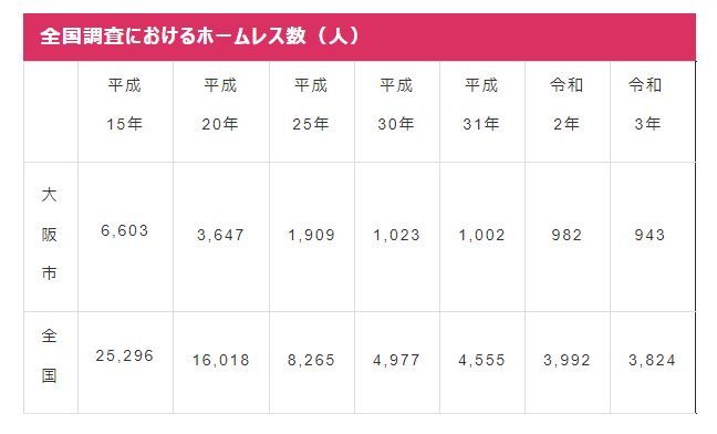 2003年の厚生労働省による調査では、全国のホームレスは約2万5296人、そのうち大阪市は6603人もいた。約4分の1を大阪市が占めていたことになる。その後、同省が2021年4月に調査したところではホームレスは3824人となり、2003年から比べると激減している。大阪市内のホームレスは943人。18年前に比べると大幅に減ったとはいえ、それでも大阪市は全国的には最多である。