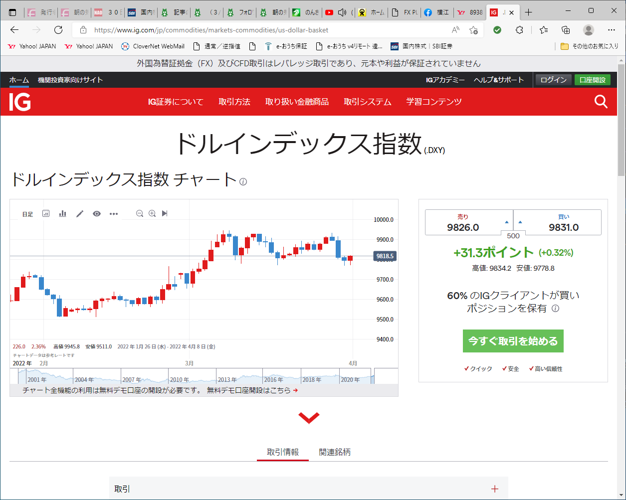 ウェブで読む(推奨):https://foomii.com/00241/2022033121014692827 //////////////////////////////////////////////////////////////// 小資本で始める株式投資 https://foomii.com/00241 //////////////////////////////////////////////////////////////// 皆様こんばんは。 3/31(木)の売買報告です。 B口座(3/31) 現金残高 34868円 株式評価 42口x14660円=615720円 合計評価 650588円(-5667円) 3日振り反落 今日のB口座も売りで1回転でした。・・・口数は売りつなぎは42口でした。 A口座(3/31) 現金残高 1622825円、+4524円 229勝3敗、17連勝 本日は負けトレードが0回。3回転でした。 通算の負けトレードは77敗のままです。 スイング退職金PF(3/31) 退職金PF総評価額は、2610666円、+75832円でした。 スイング口座は3連騰となりました。 さて今日の日経レバは、寄り安値で大きく切り返しましたが、結局大引けにかけては再び安くなってしまいました。ドル円相場の不安定さに原因がありますね。 ドル円相場の方向性が見えづらいのはどういうことかと考えていましたが、ドルインデックス指数を見ていて、やっと原因に気付きました。 のんきの母 追記(相場メモその94)・・・ドルインデックス指数多くの投資家はドル円チャートとかを見てFX取引を行いますが、同じ円安でも実は円高ということもあります・・・その場合は円以上にドルが高いとドル円相場は高くなります。つまり絶対値的な通貨の強弱を見るには、別の指数(図表)を見ないといけません。 世界の26通貨を比較して、米ドルだけの現在の高安を表現したものがドルインデックス指数です。今日はそれを掲示してみました。(日足です) なんと米ドルは昨日ブレークダウン場面を迎えたことがわかります。今日は微妙に戻していますのでまだ明確にダウントレンドとは言えません。 ウクライナ戦争により、有事のドル買いで順調に上がっていたのですが、3月に入ってからは高値保合いとなっていましたが、昨日から怪しくなりました・・・その原因はいろいろ考えられます。今はその原因よりも実際にドルが安くなりそうだということが大事です。 つまり、ドル安、円安というダブル安の展開がありえます。そうなるとドル円相場は難しくなります。 とにかくドル安の兆候が出てきたことに私たちは注目すべきと思います。 ドル安はあらゆる商品・株式に影響を与えますので注意したいですね。 参考になれば幸いです。 //////////////////////////////////////////////////////////////// 本ウェブマガジンに対するご意見、ご感想は、このメールアドレス宛に返信をお願いいたします。 //////////////////////////////////////////////////////////////// 配信記事は、マイページから閲覧、再送することができます。ご活用ください。 マイページ:https://foomii.com/mypage/ //////////////////////////////////////////////////////////////// 【ディスクレーマー】 本内容は法律上の著作物であり、各国の著作権法その他の法律によって保護されています。 本著作物を無断で使用すること(複写、複製、転載、再販売など)は法律上禁じられており、刑事上・民事上の責任を負うことになります。 本著作物の内容は、著作者自身によって、書籍、論文等に再利用される可能性があります。 本コンテンツの転載を発見した場合には、下記通報窓口までご連絡をお願いします。 お問い合わせ先:support@foomii.co.jp //////////////////////////////////////////////////////////////// ■ ウェブマガジンの購読や課金に関するお問い合わせはこちら info@foomii.com ■ 配信停止はこちらから:https://foomii.com/mypage/ ////////////////////////////////////////////////////////////////
