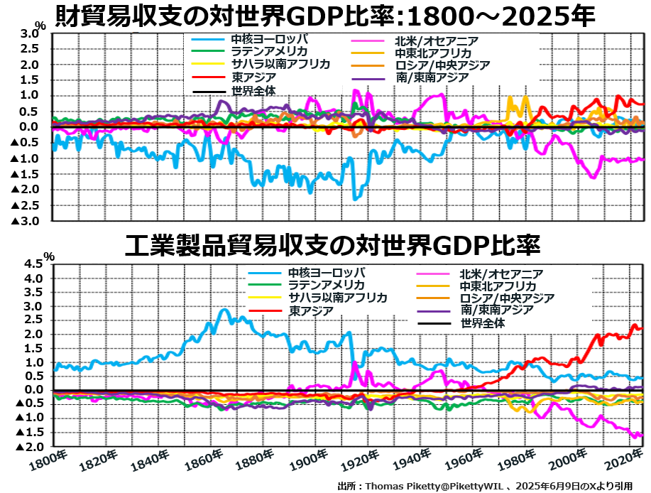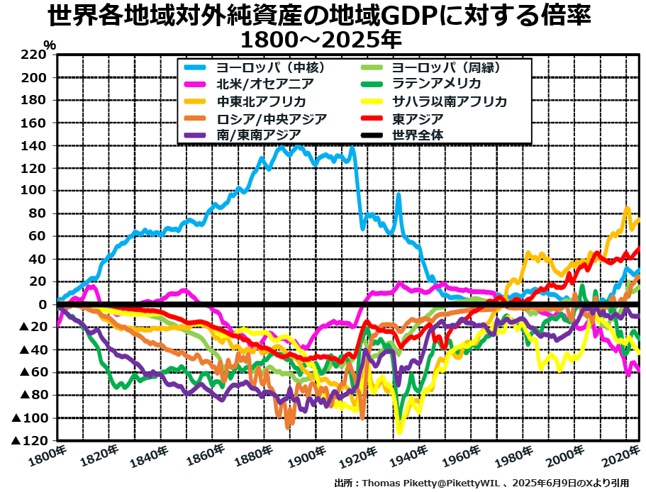 そして19世紀初めまでさかのぼっても、他に対外純資産を持ったことがある地域は奴隷制プランテーションで巨万の富を築いていたアメリカ合衆国を中心とする北アメリカ・オセアニア地域だけだったのですから、第一次世界大戦が起きるまではいかにヨーロッパばかりが潤っていたか分かります。