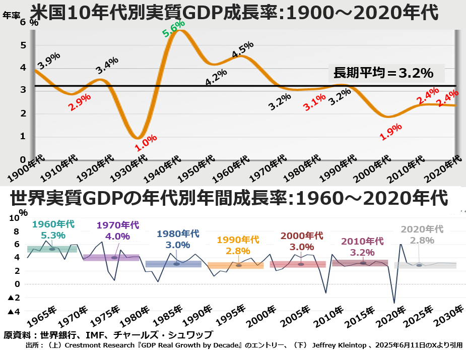 下段は1960年代からの世界のGDP成長率を10年代ごとの平均値にしてまとめたグラフです。こちらも年代が進むにつれて成長率が下がる傾向はありますが、アメリカほど大きく鈍化しているわけではありません。