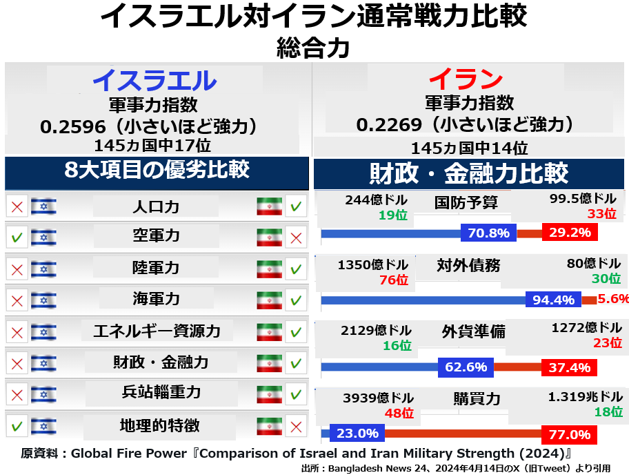 具体的にイスラエルの軍事力がどのくらいイランに劣っているかを、確認していきましょう。まず総合力と財政・金融力の比較です。