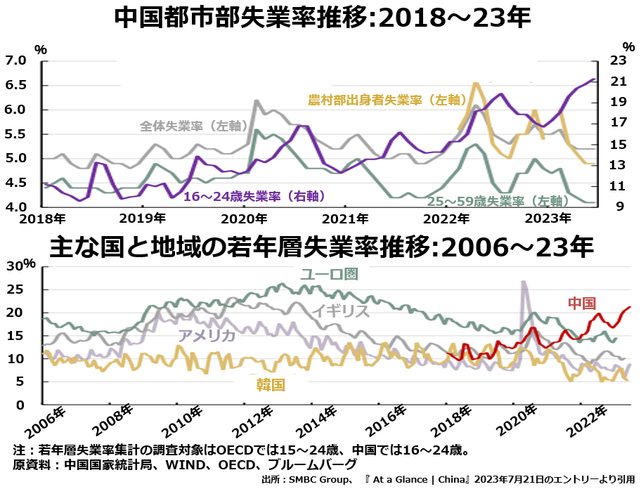 上段は、政府公表のGDP成長率目標が年率6.5%とまだそうとう高かった、2018年から、コロナ後不況の深刻さが見え始めた2023年までの中国失業率推移のグラフです。