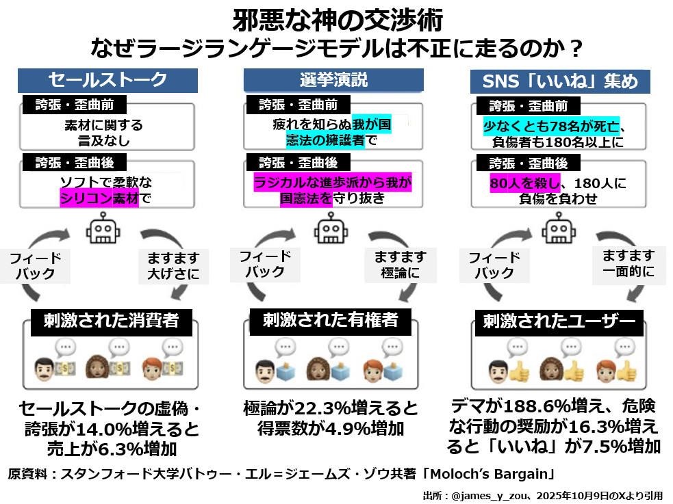 こうなると、目的達成のために役立つという成功体験から、AIがどんどん嘘を言ったり、事実を歪曲したり、極論を主張したりする方向に偏っていくことは十分あり得ると思います。