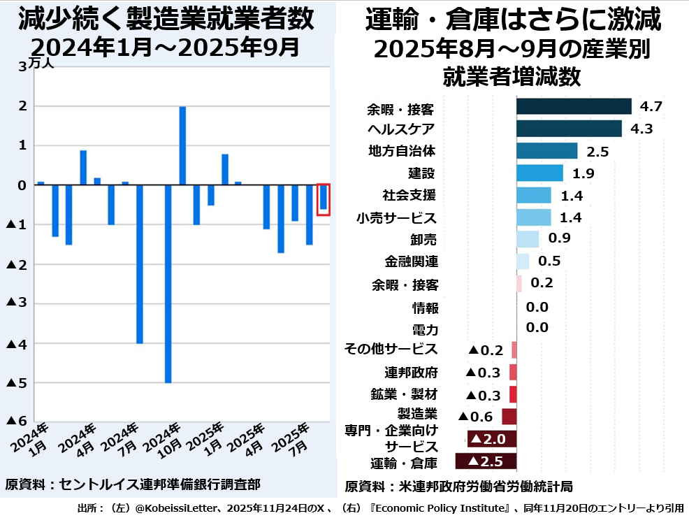 その傾向は、トランプ言うところの「解放の日」、今年の4月2日に大幅な「報復」関税が発表されてからというもの、製造業就業者数が毎月減少していることにもはっきり表れています。次の2枚組グラフの右側です。