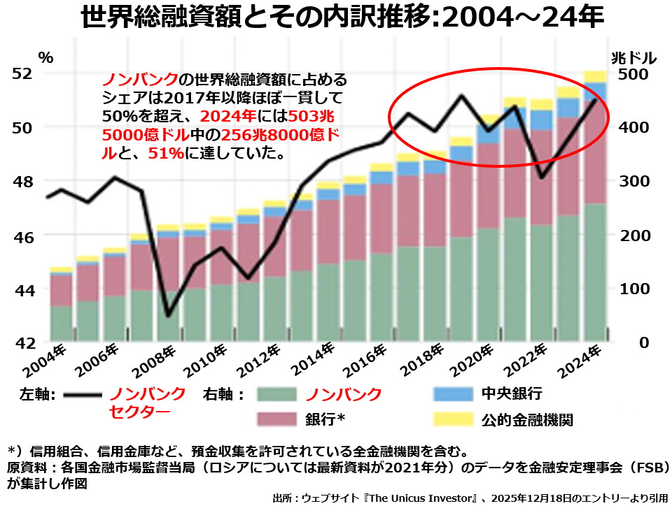 21世紀に入ってからの世界経済では、ほぼ一貫してノンバンクによる融資が融資総額の45%を超え、それより下がっていたのは2008年のようにノンバンクによる過剰融資に関する警戒感が異常なほど高まった年だけでした。
